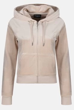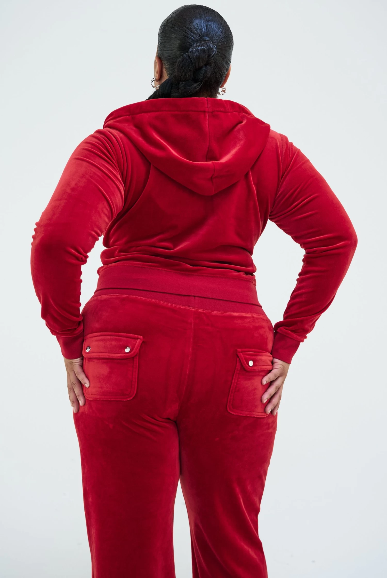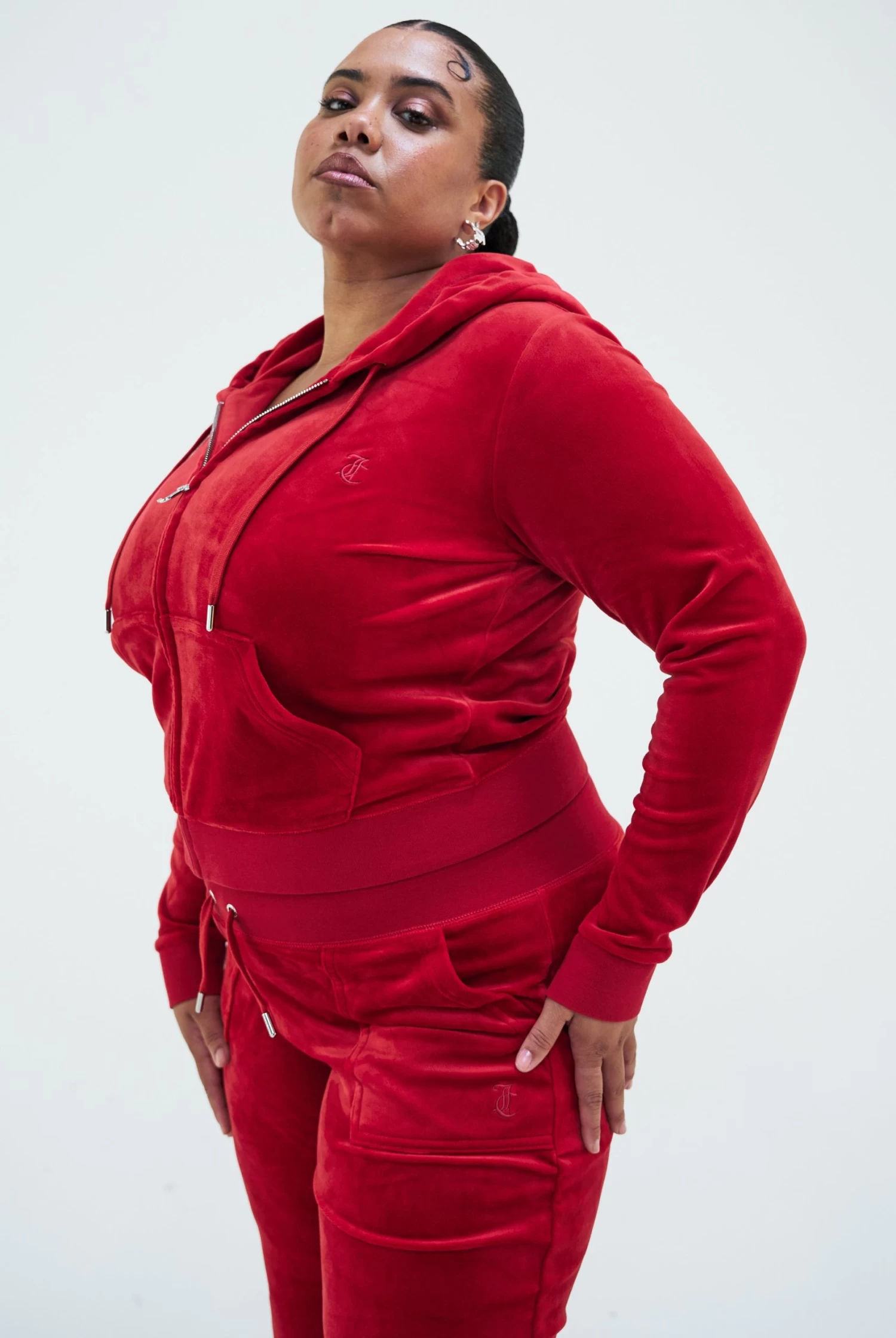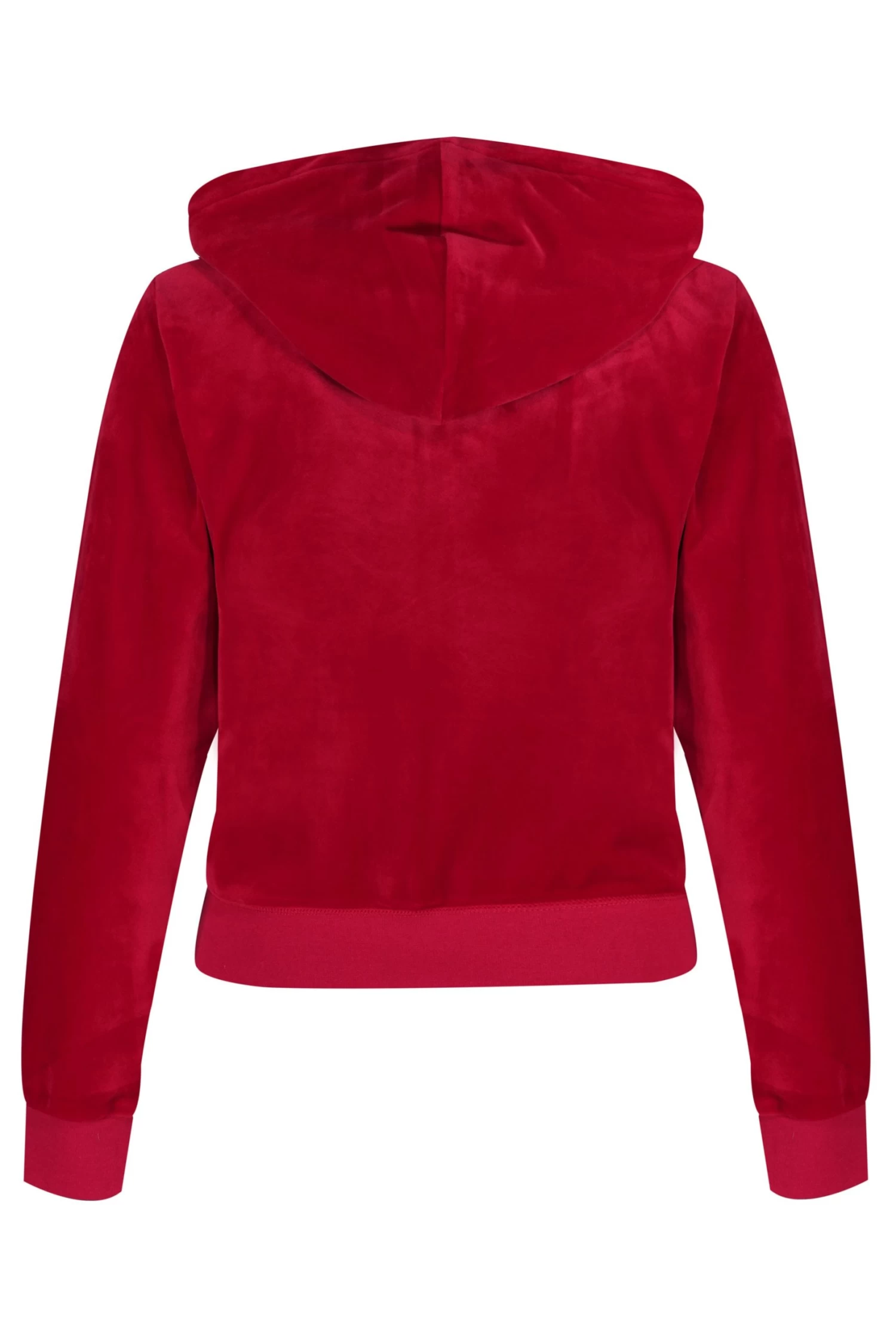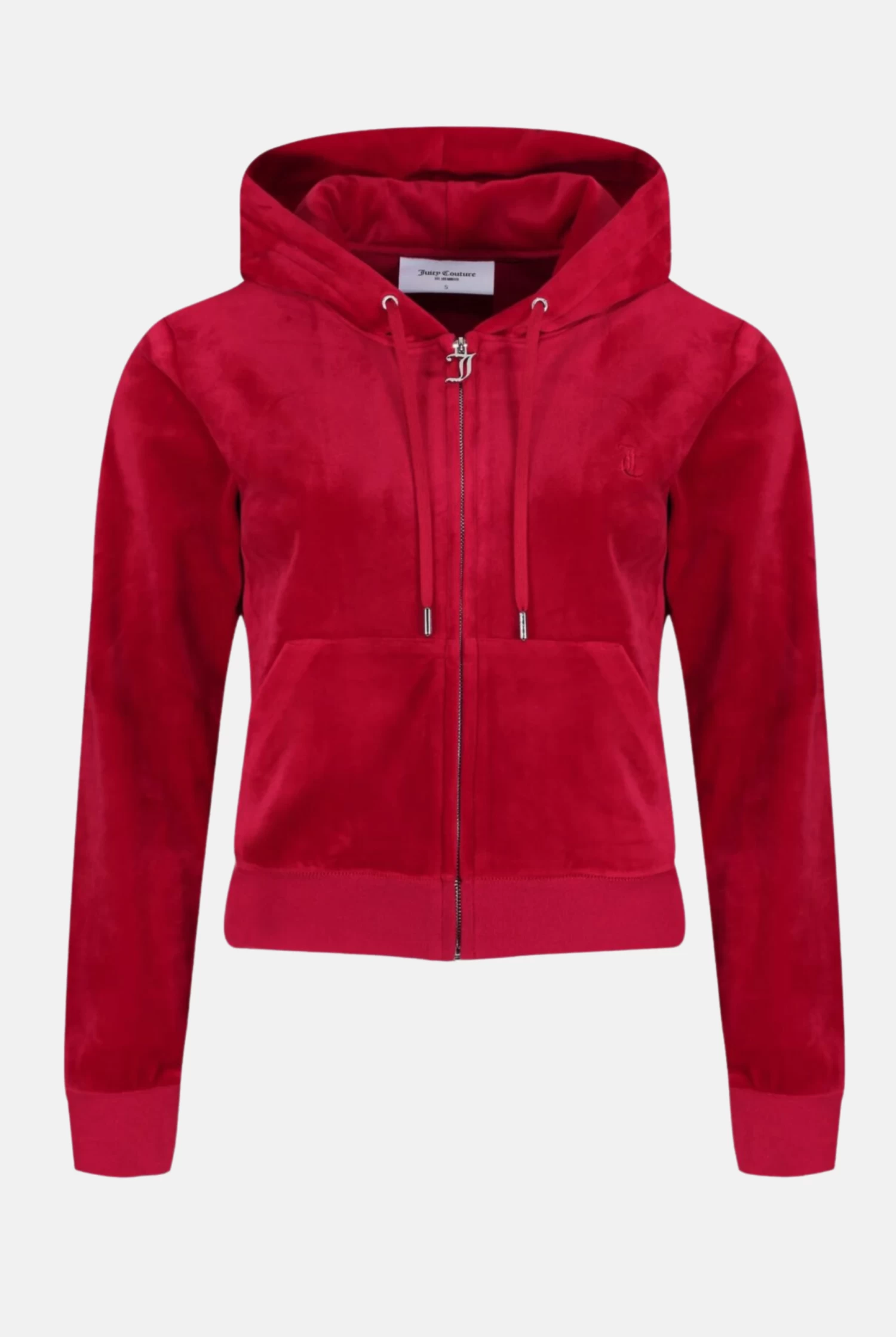 Zip through hoodie in astor red classic velour. Slim fit, with kangaroo pockets and a self-fabric lined hood, this core hoodie features a statement gothic J zip pull and is branded with a tonal embroidered JC logo at the chest.