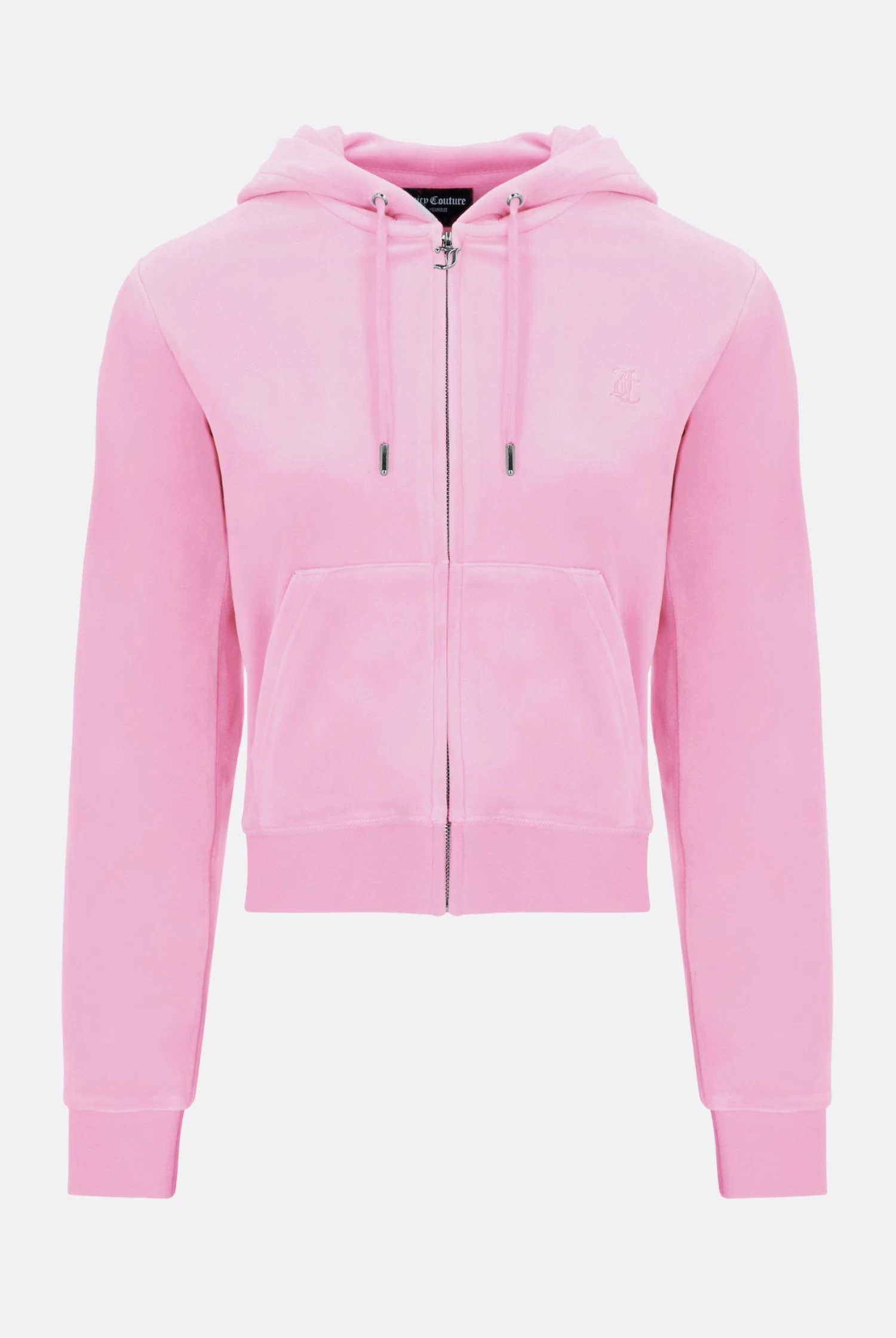 Zip through hoodie in begonia pink classic velour. Slim fit, with kangaroo pockets and a self-fabric lined hood, this core hoodie features a statement gothic J zip pull and is branded with a tonal embroidered JC logo at the chest.
