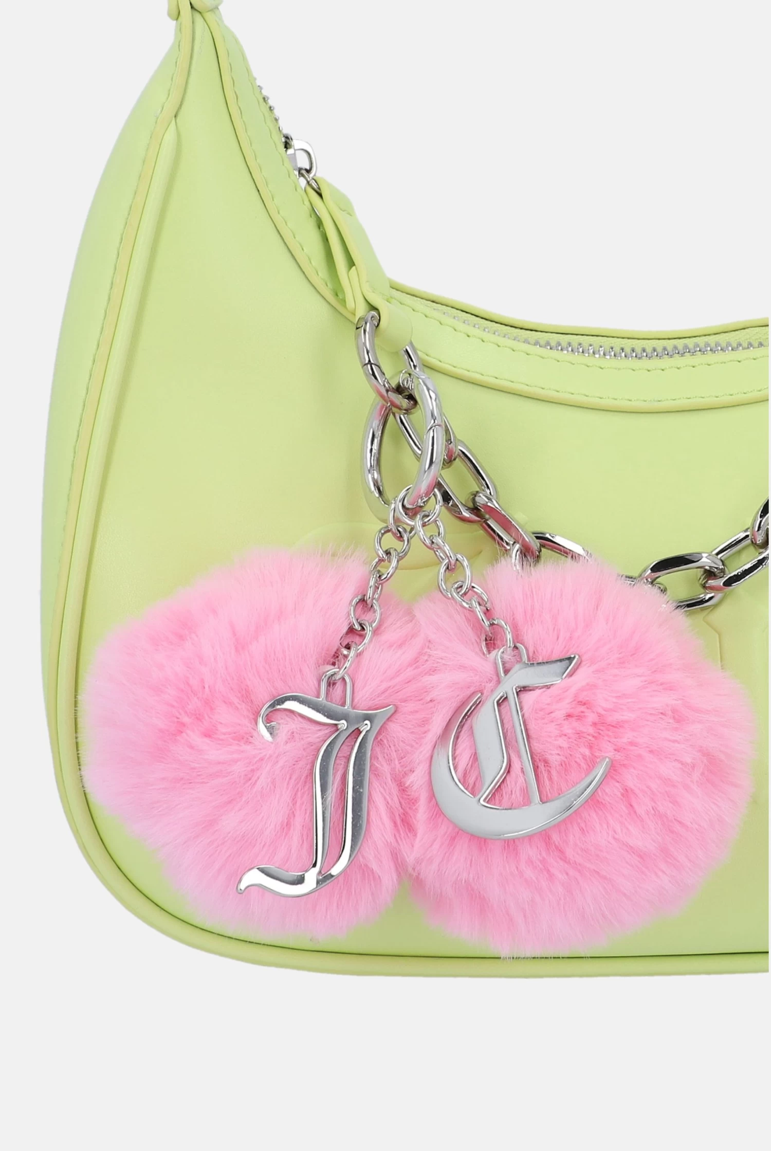 Pom pom key fob in begonia pink faux fur. This keychain features gothic J and C metal charms on a branded split ring so you can easily clip onto your keys or favourite Juicy handbag.