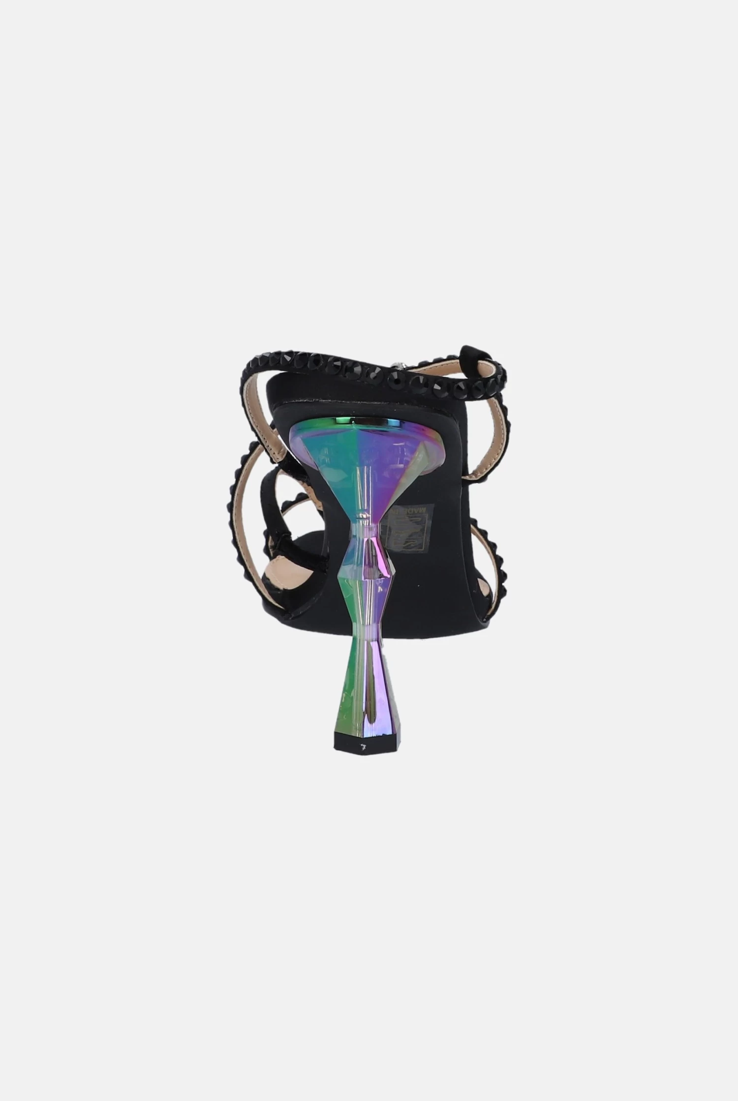 High heel sandal in black metallic PU. This delicate square toe strappy sandal features an iridescent diamond shaped perspex heel, diamante hot fix upper and a diamante branded ‘JC’ dangling charm.
