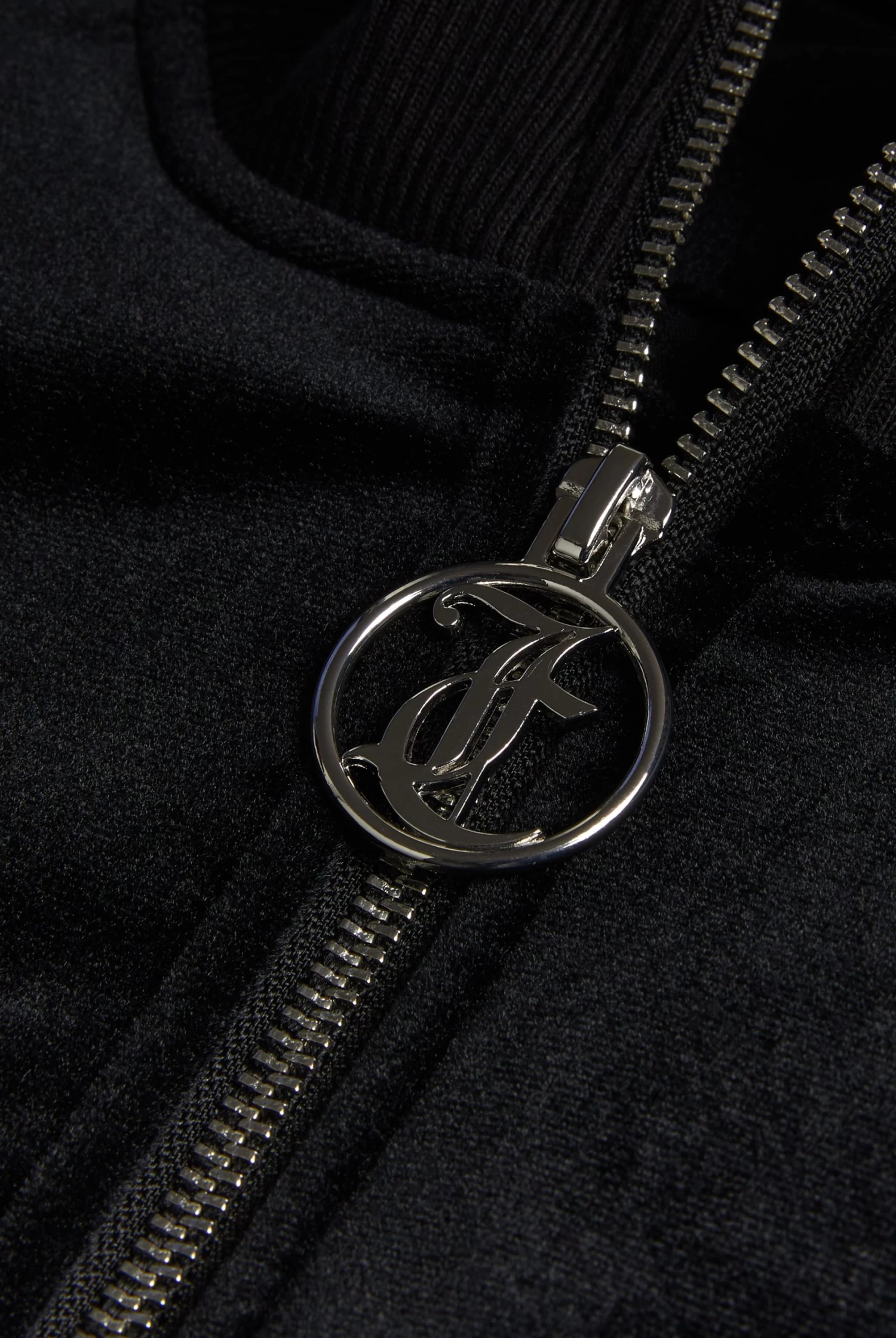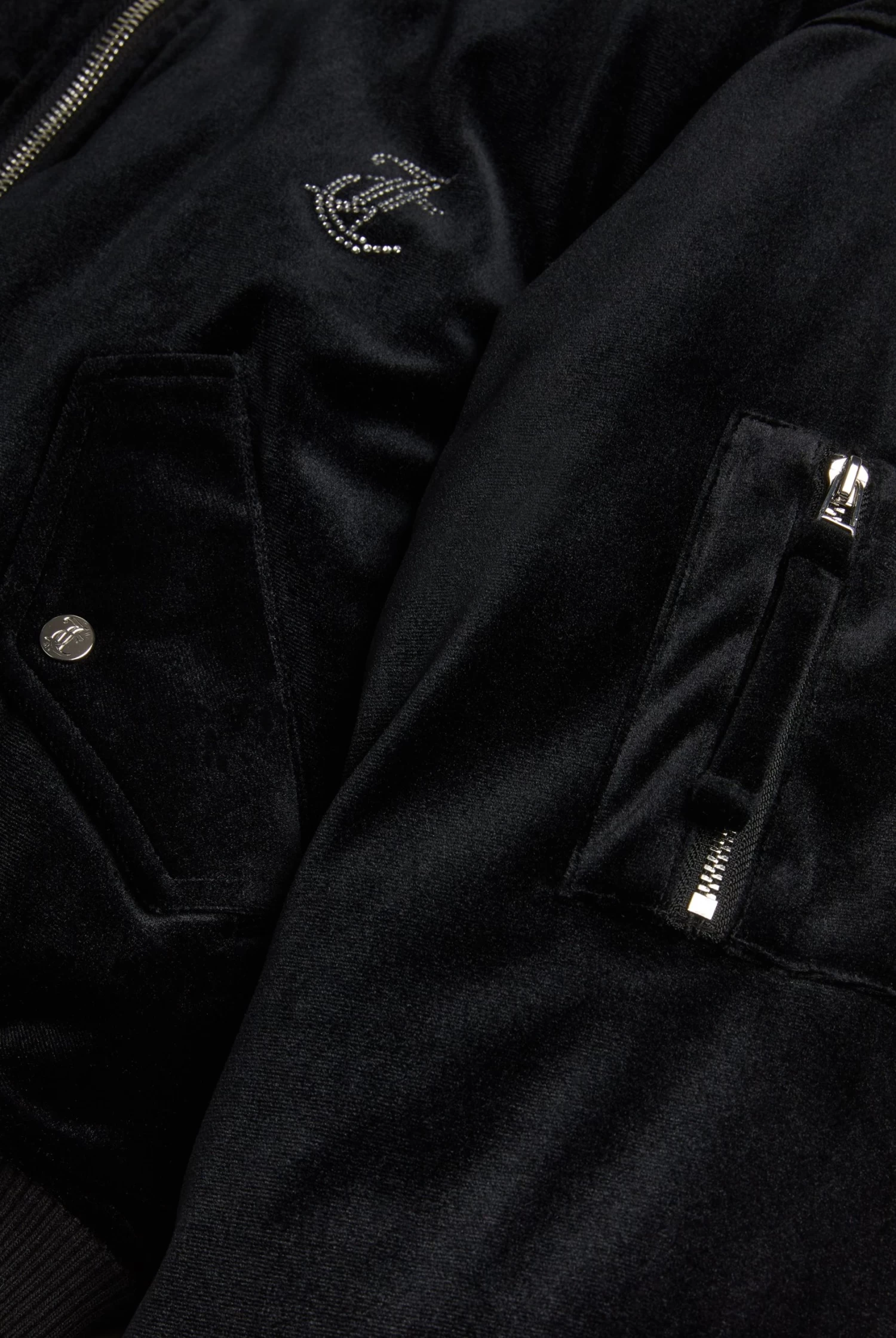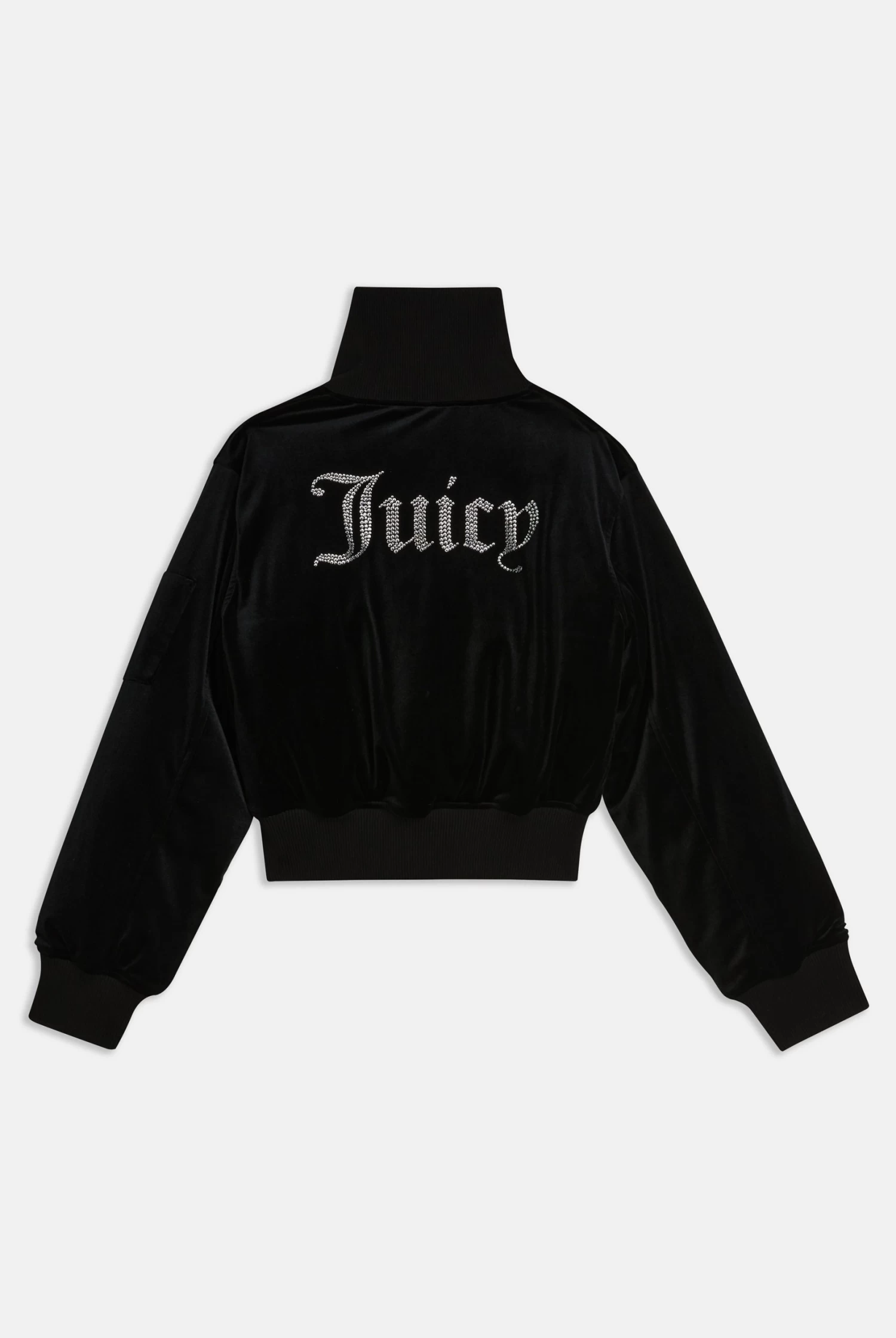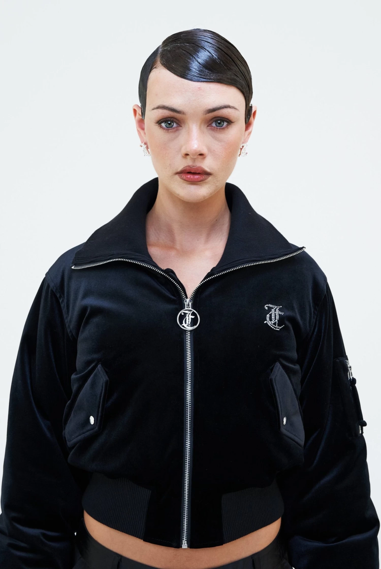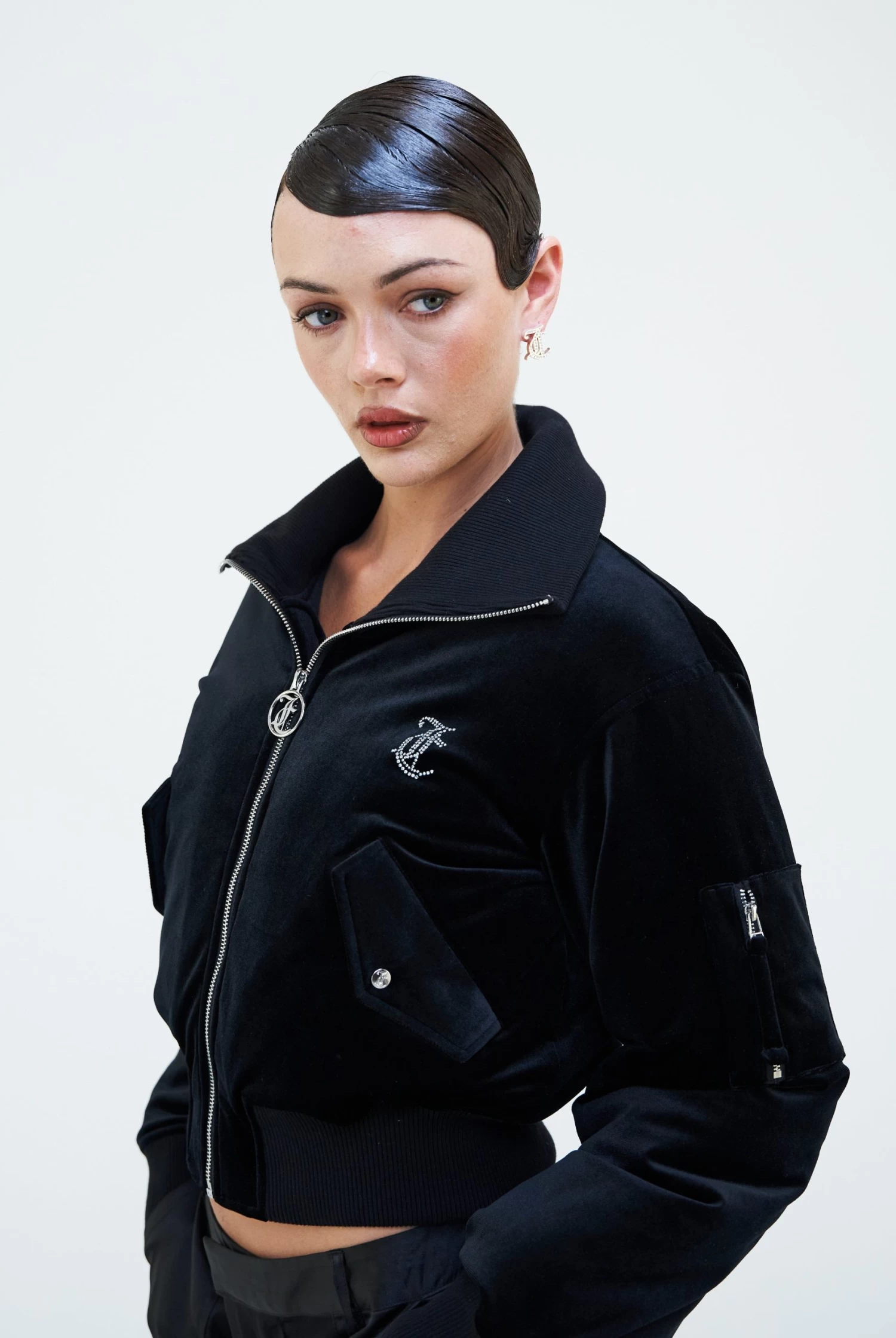 Bomber jacket in black classic velour. Featuring a deep rib hem and turned down collar, front side pockets with popper fastening, round ‘JC’ zip pull and a zip pocket on sleeve. This coat is branded with a diamante ‘JC’ crest at left chest and our iconic diamante ‘Juicy’ across back.