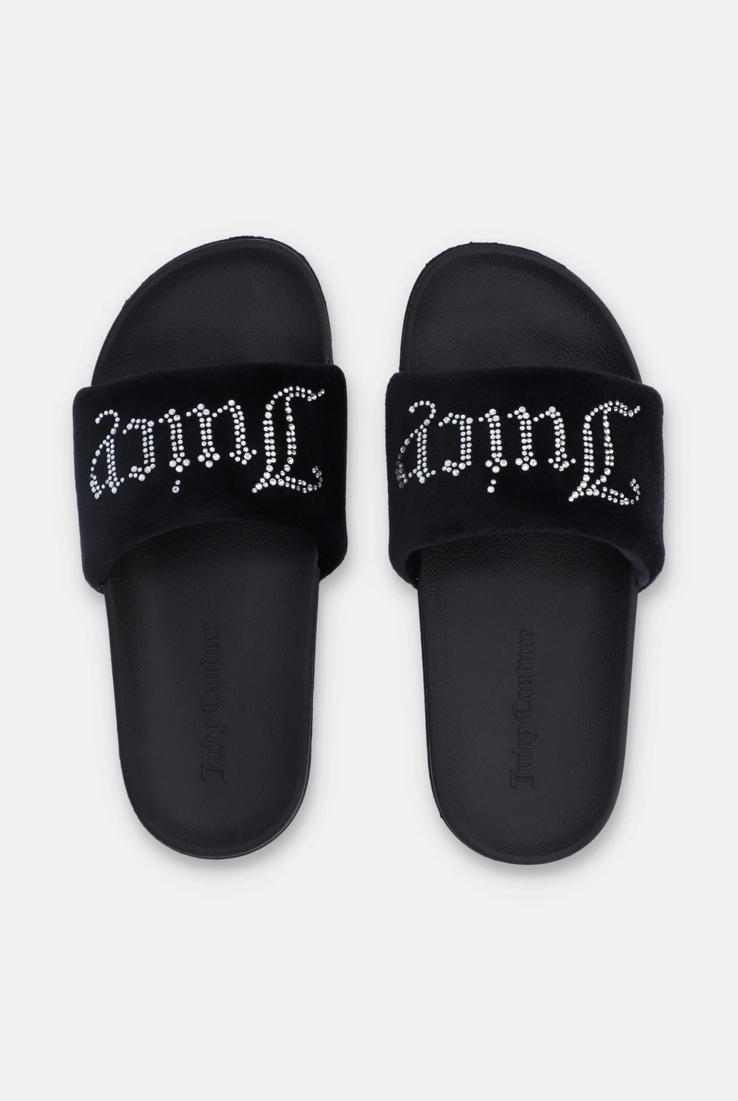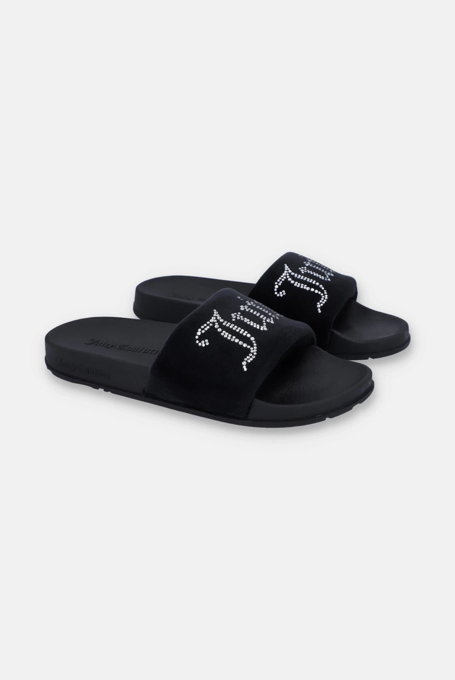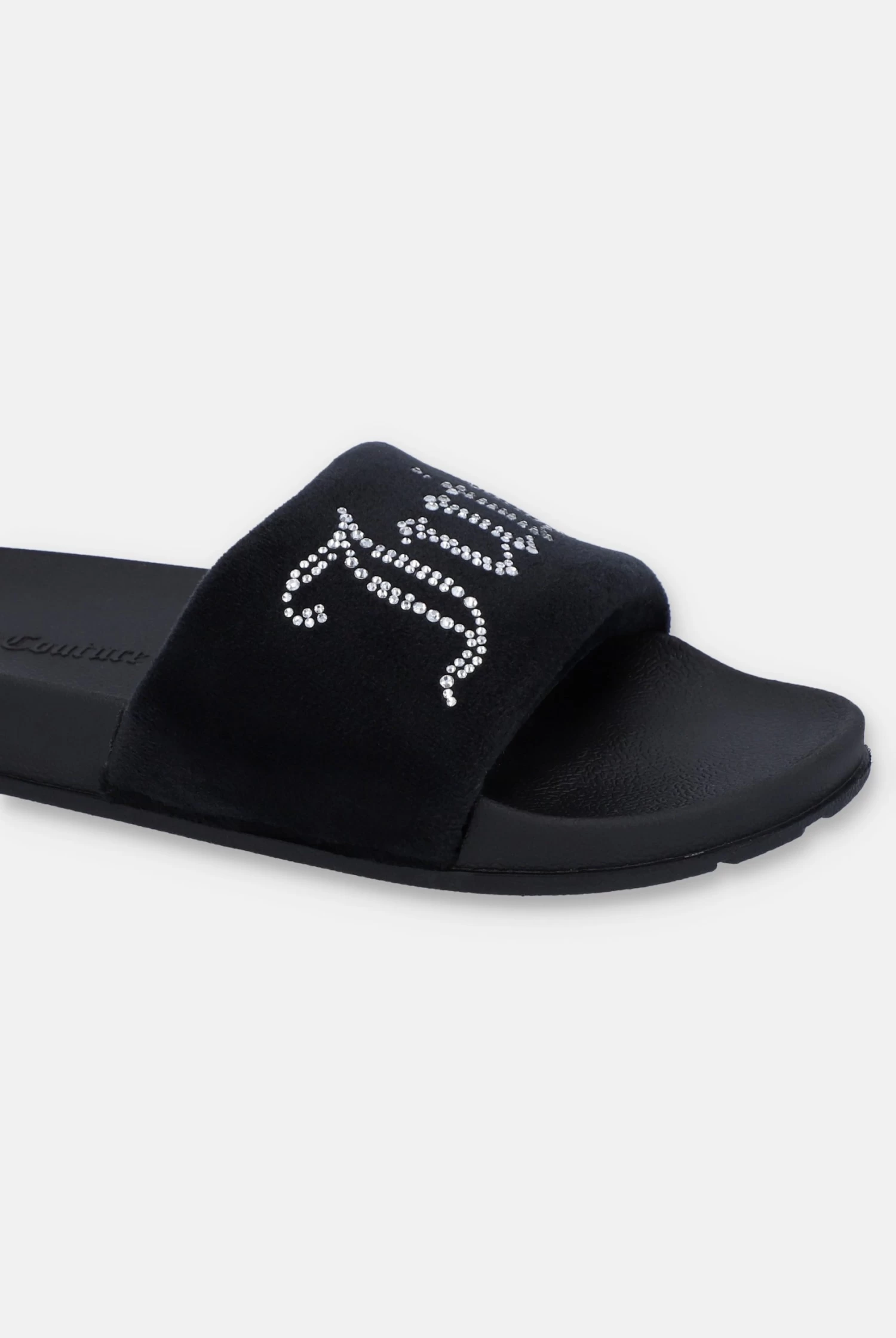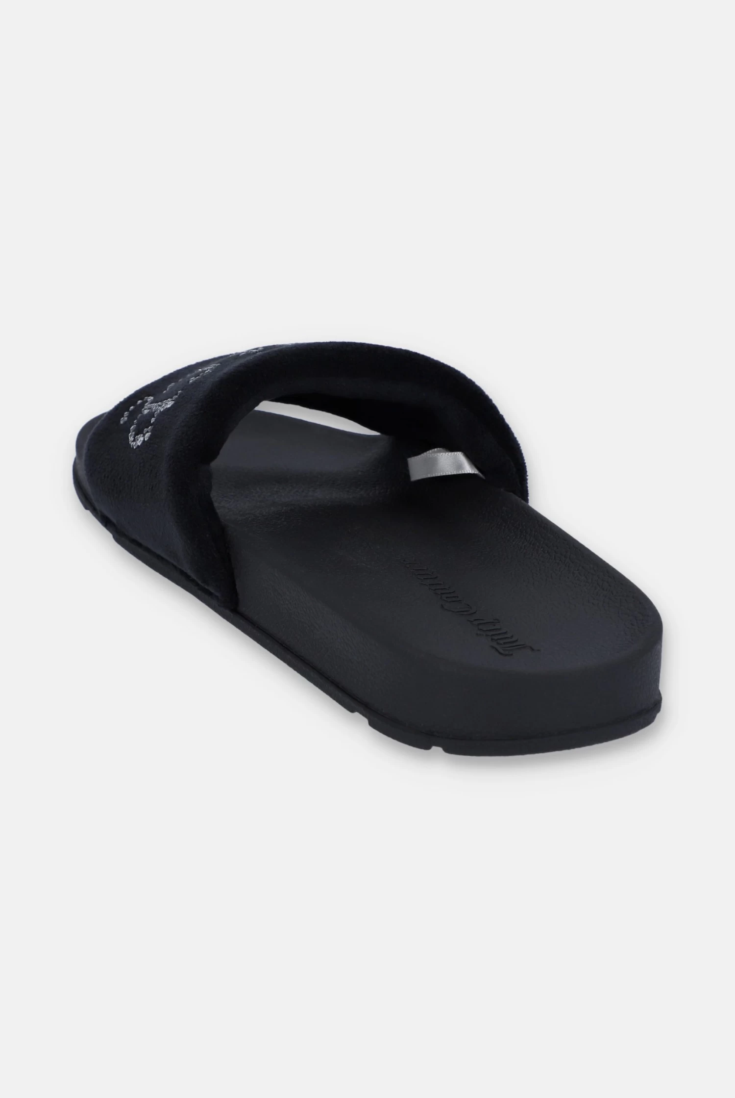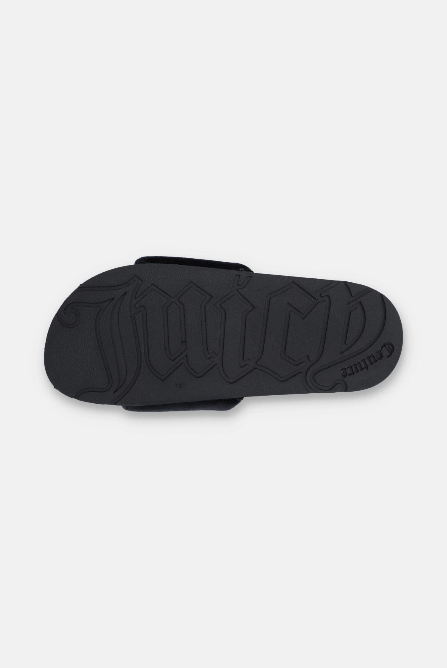 Black padded strap slider in classic velour. This slip-on design features a moulded footbed, padded strap and a soft cushioned branded EVA outsole for added comfort. Branded with a hot fix diamante ‘Juicy’ logo across strap.