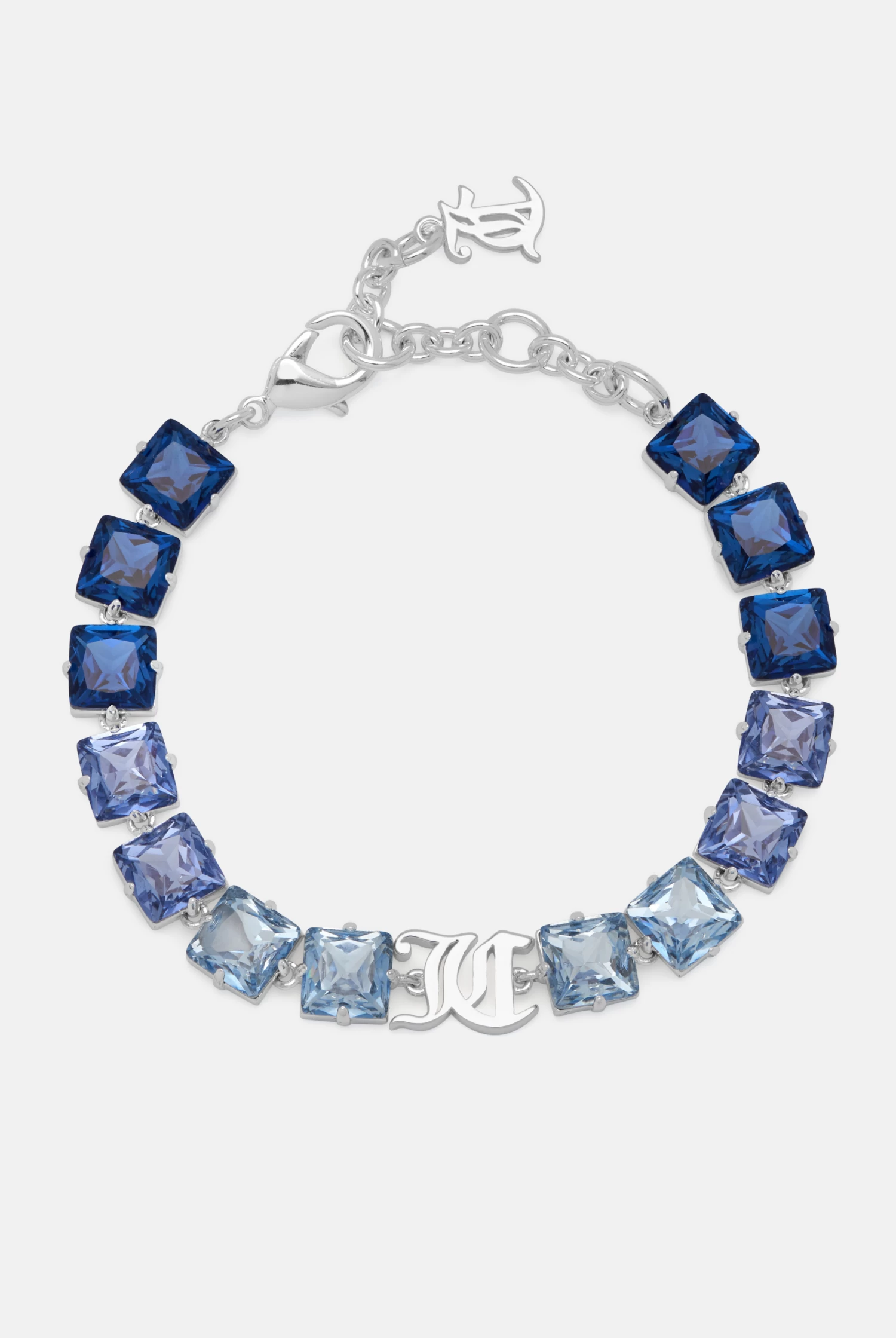 Silver plated bracelet featuring an ombre of blue shaded crystals, set with a silver plated iconic gothic font ‘JC’ initials and finished with an adjustable length chain and clasp with the mini ‘JC’ initials.