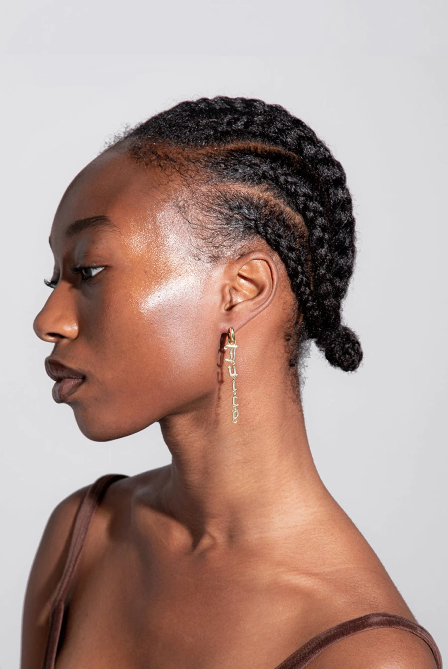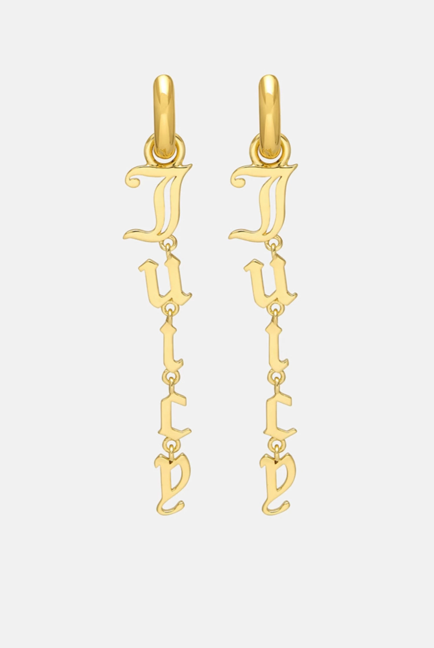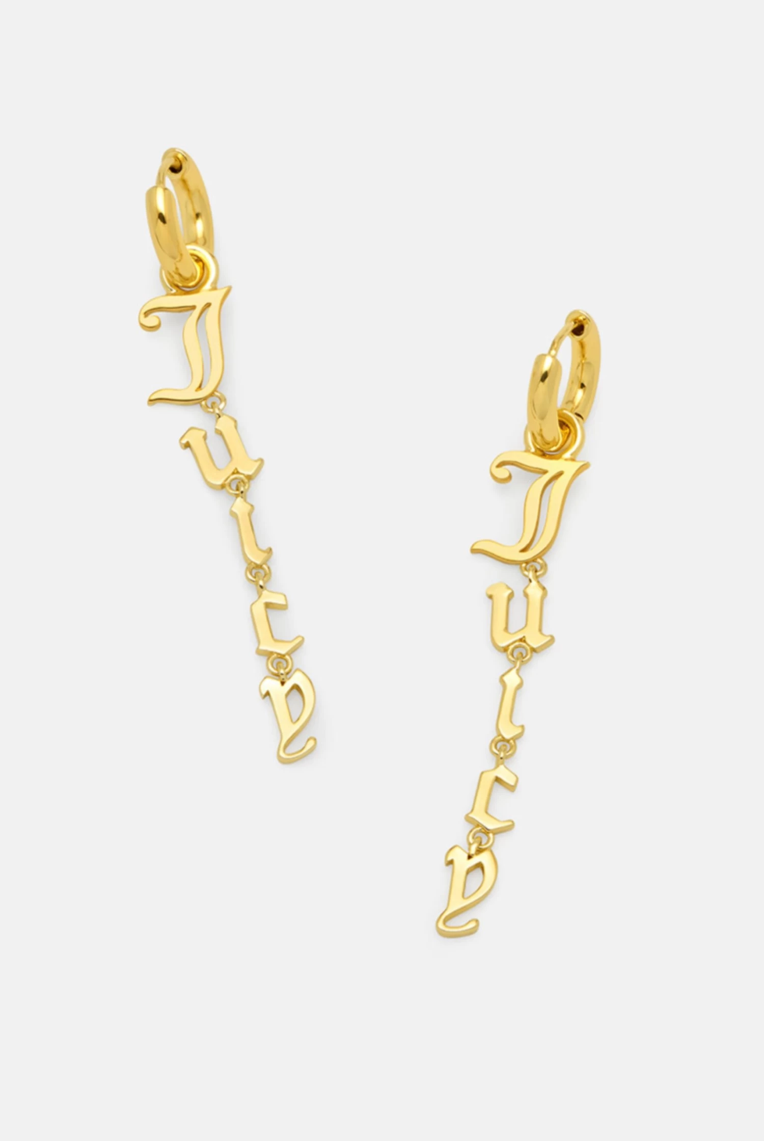 Dangle earrings crafted in 18ct gold plate featuring mini huggie hoops and detachable vertical Iconic gothic font ‘Juicy’ logo charm.