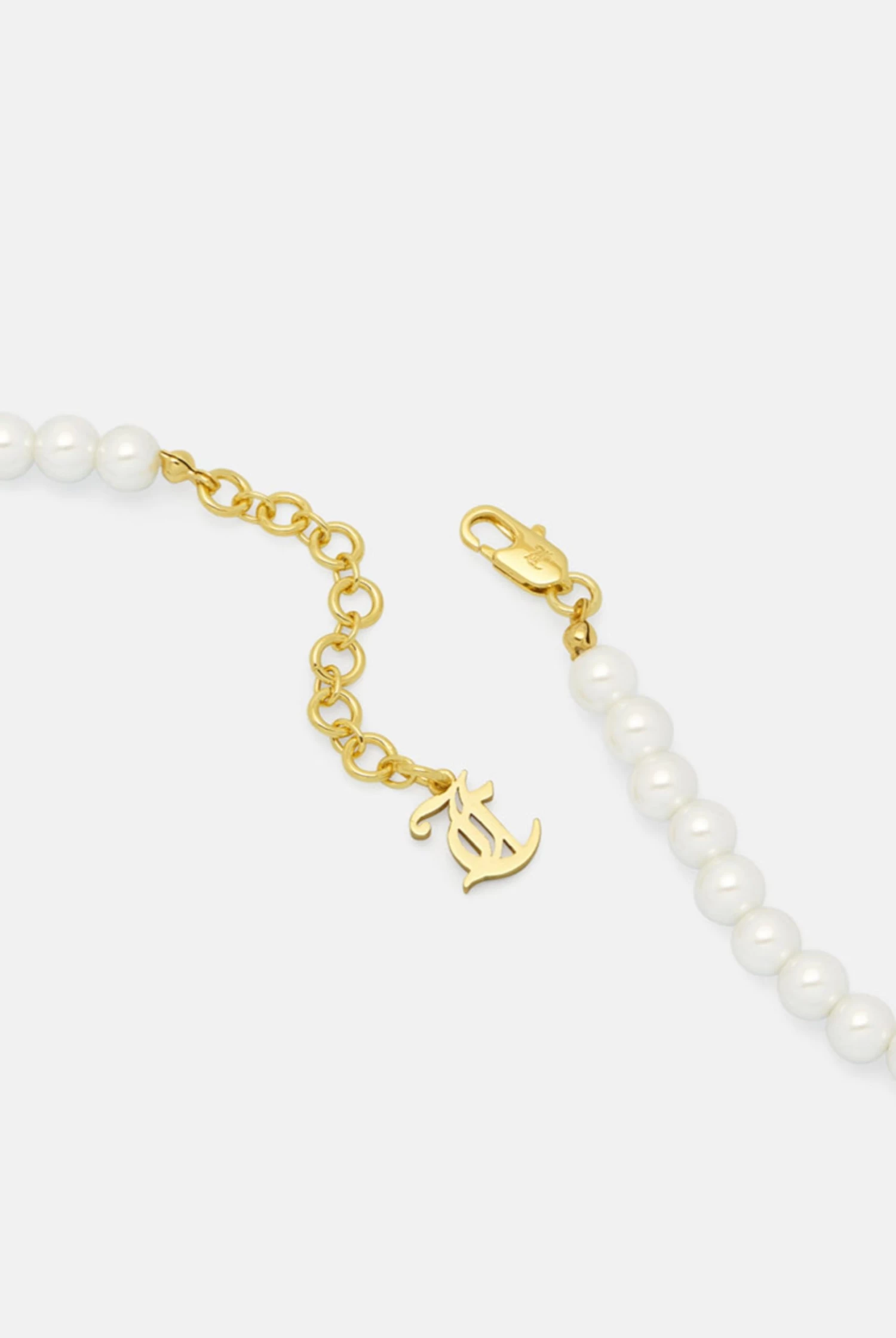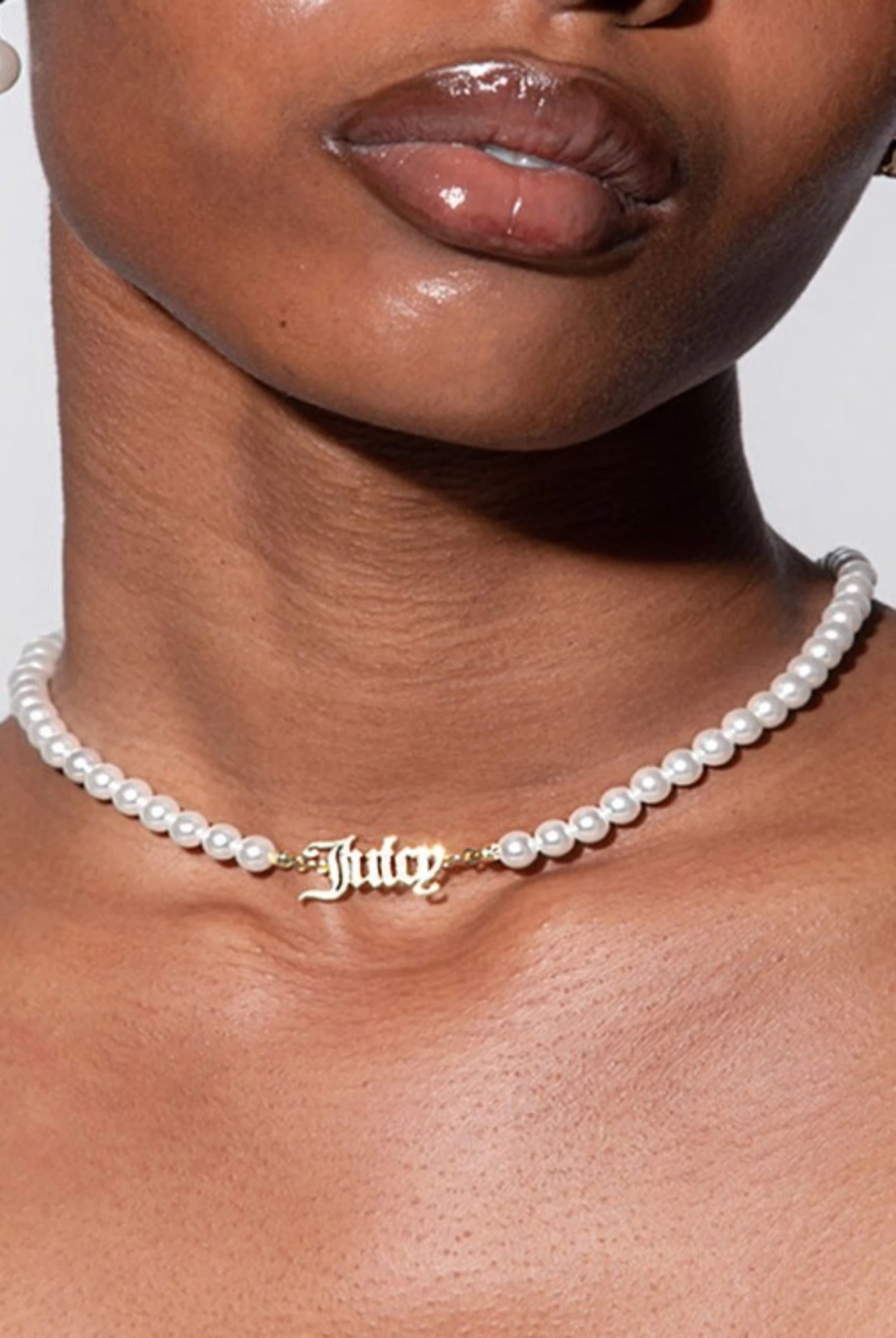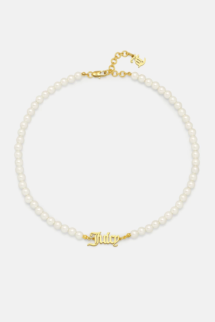 Pearl choker featuring the iconic gothic font ‘Juicy’ logo crafted in 18ct gold plate. Finished with an 18ct gold plated adjustable chain with clasp and mini ‘JC’ charm. Complete the look with the matching bracelet.