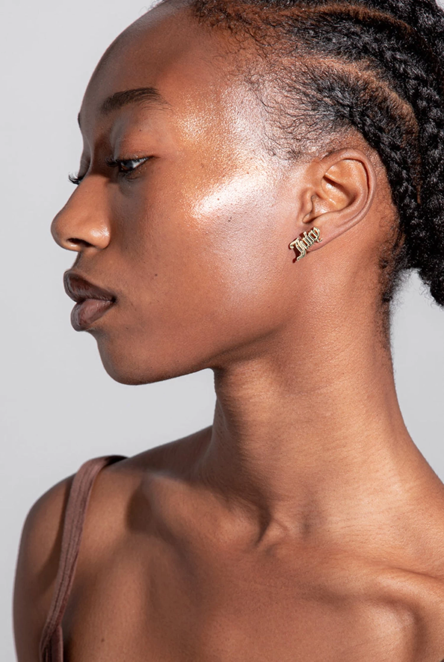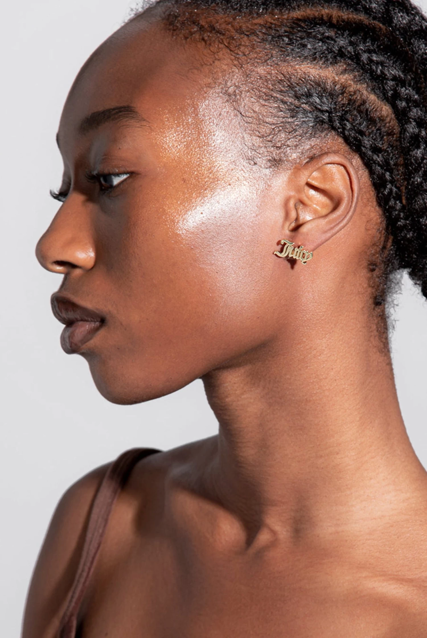 Iconic gothic font ‘Juicy’ stud earrings crafted in 18ct gold plate.
