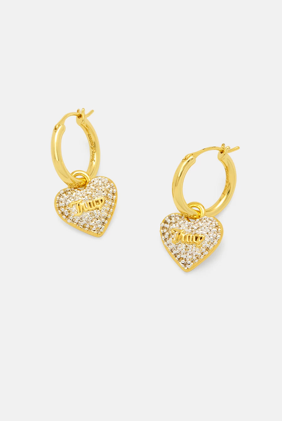 Huggie hoop earrings crafted in 18ct gold plate with gold plated detachable heart charms embellished with pavé crystals, embossed with the iconic gothic font ‘Juicy’ logo