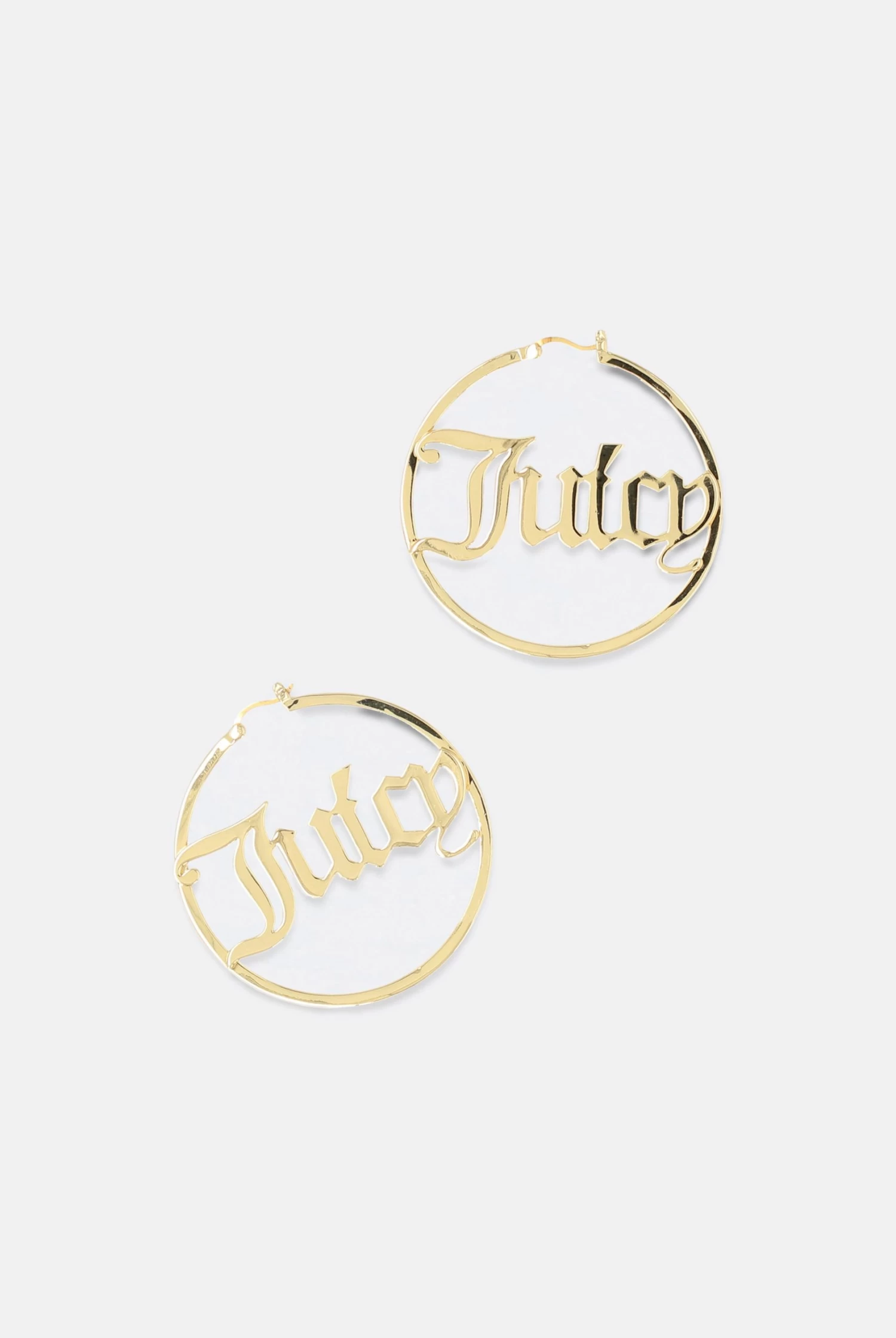 Small 18ct gold plated hoop earrings inserted with the iconic gothic font ‘Juicy’ logo in the centre.