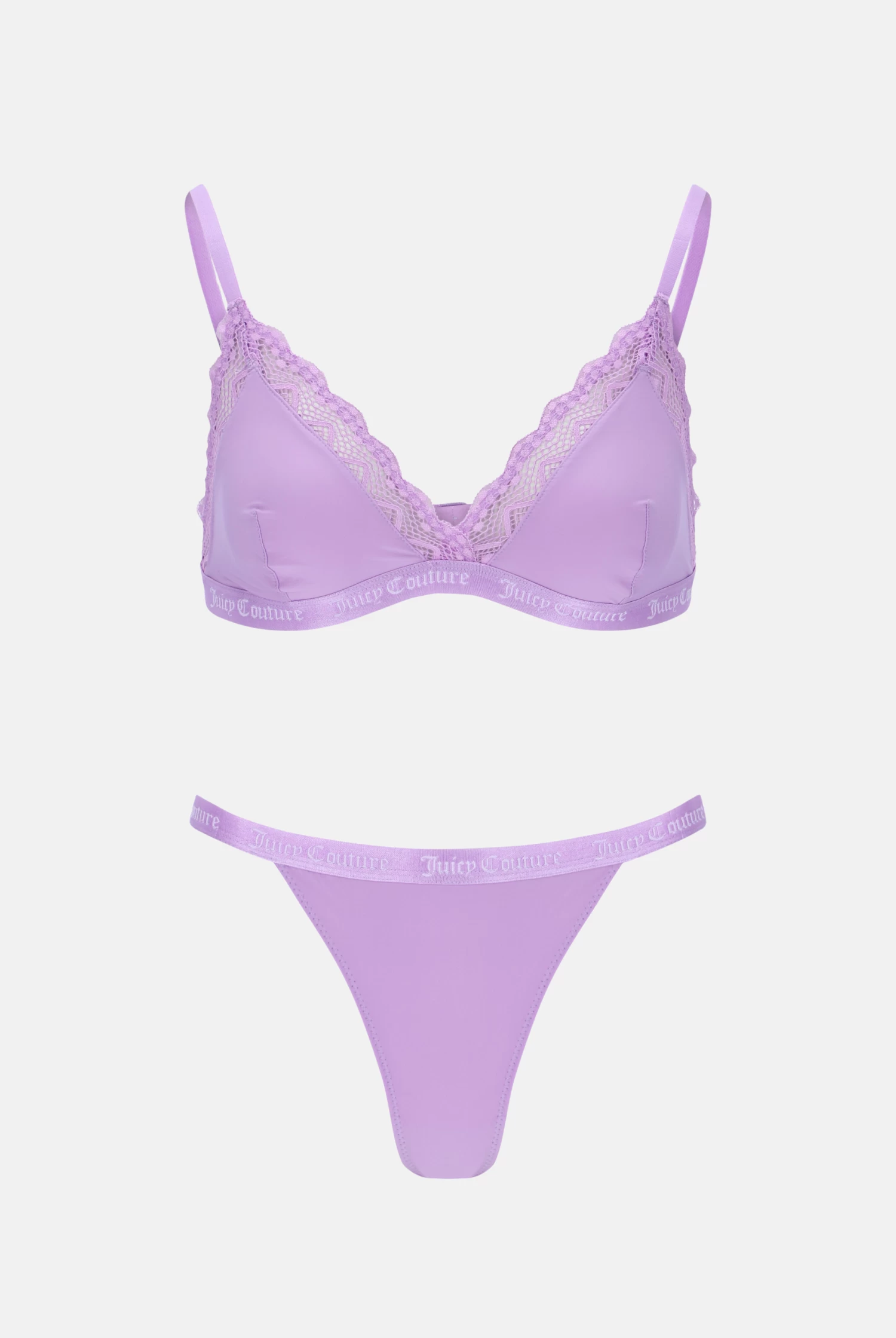 The Juicy Couture Lace Trim Bra And Thong Set is a matching set of lingerie that includes a bra and thong. The bra features delicate lace trim and adjustable straps for a comfortable fit, while the thong also has lace detailing and a mid-rise waistband. Both pieces are made from a soft and stretchy fabric for all-day comfort. Perfect for adding a touch of luxury to your everyday lingerie collection.