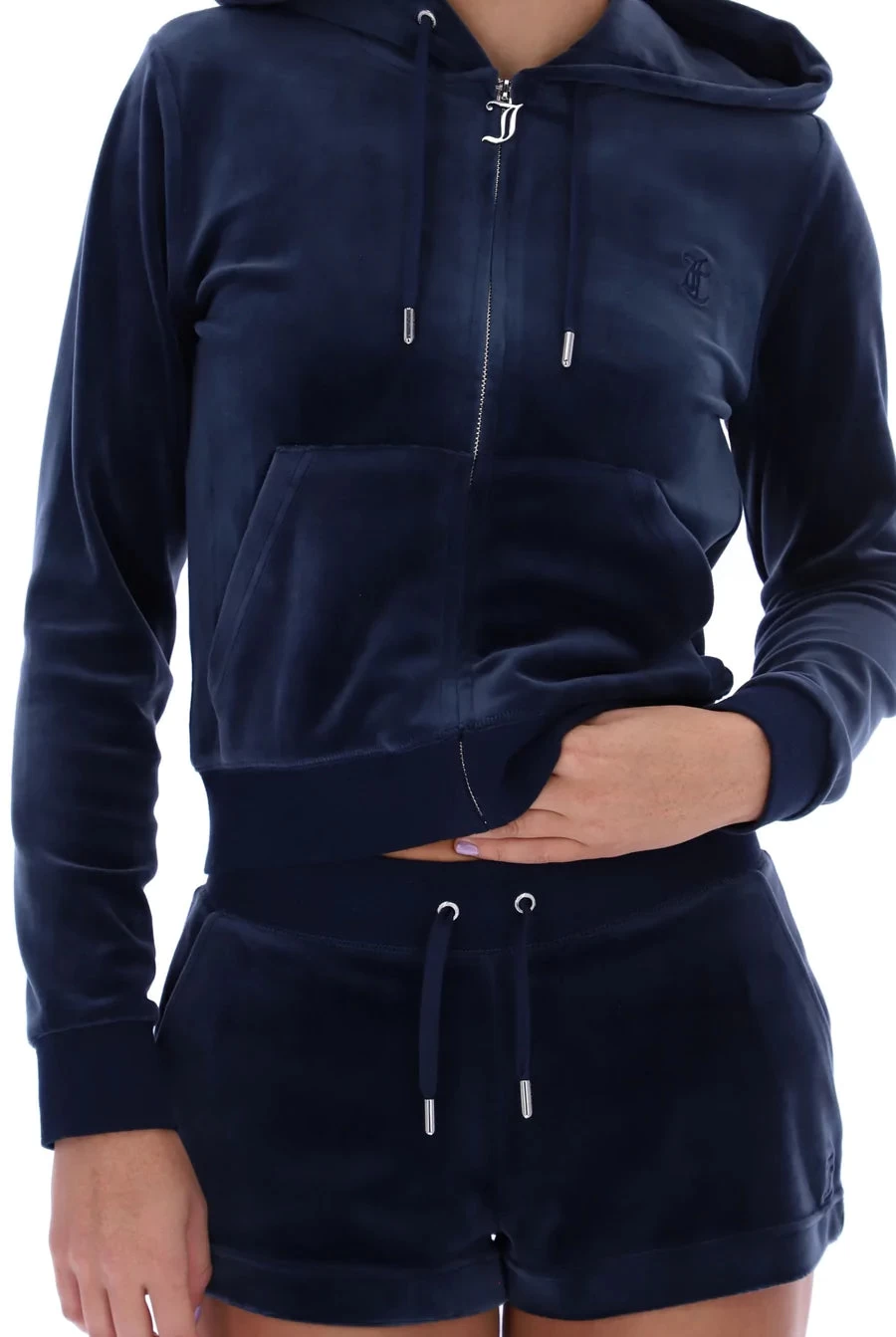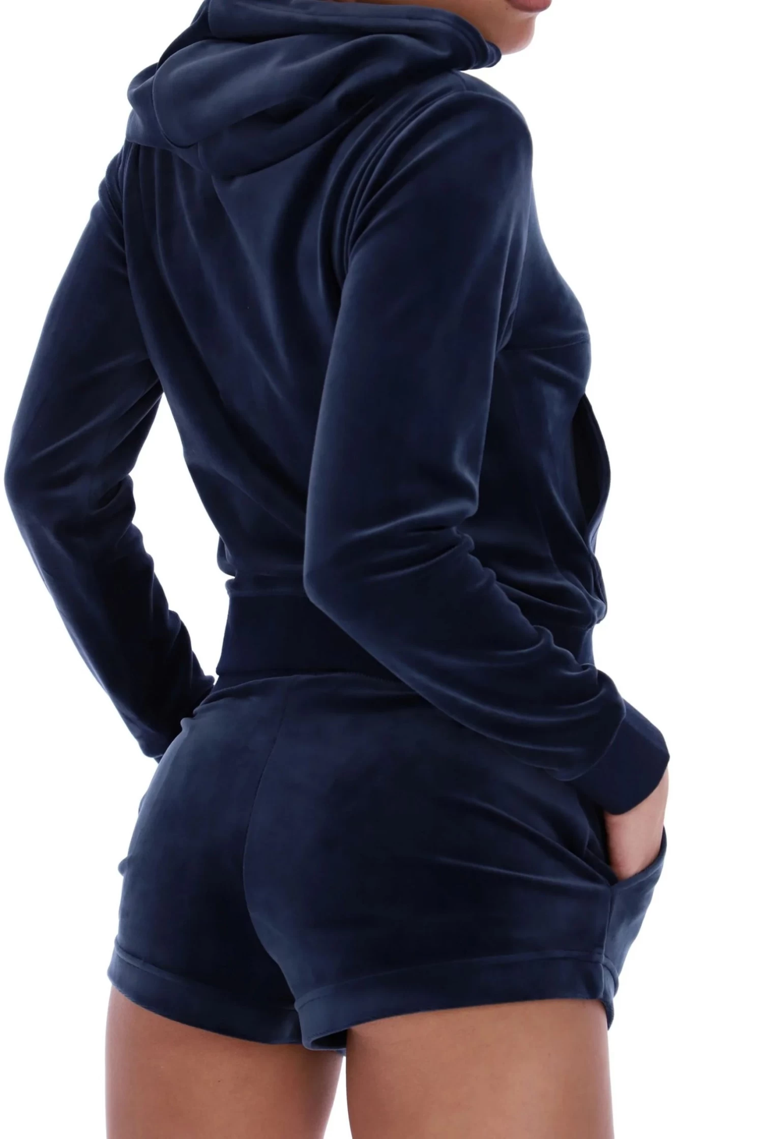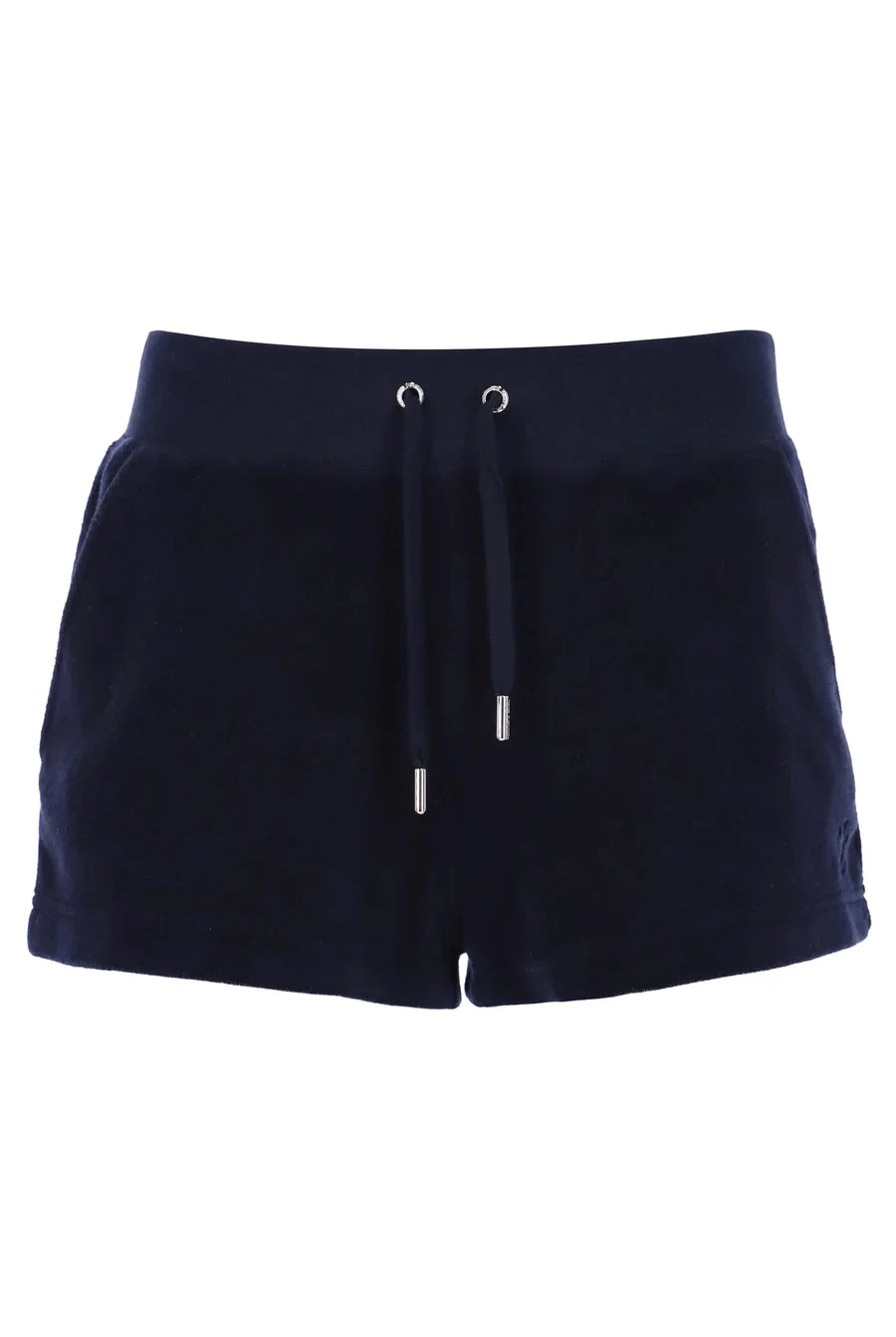 Mid-rise plain shorts in night sky classic velour. A short flirty fit, with adjustable drawstring ribbed waist and front angled pockets. These iconic core track shorts are branded with silver hardware and a tonal embroidered JC logo at the hip. Pair with the Robertson hoodie for a summer update on the staple tracksuit.