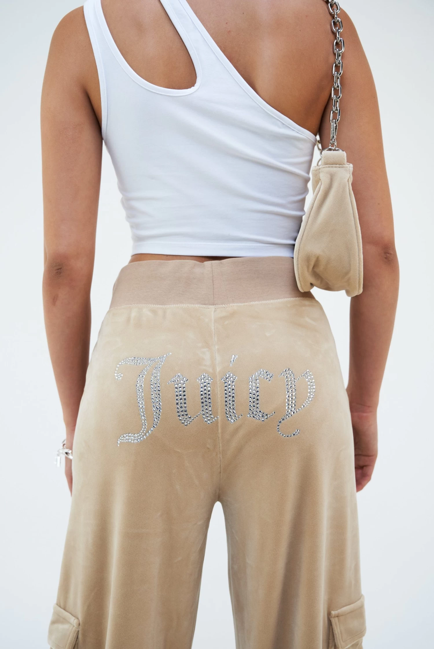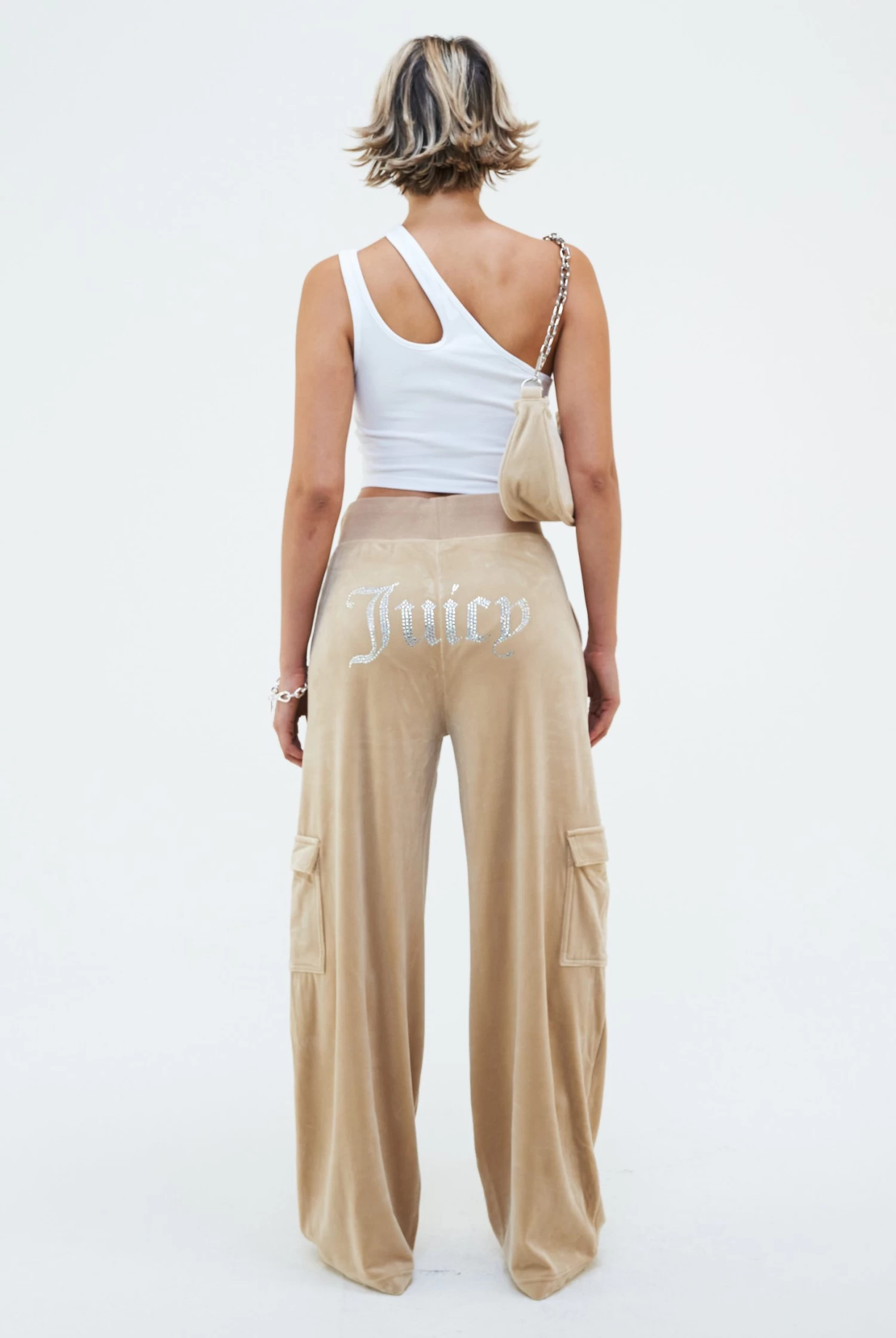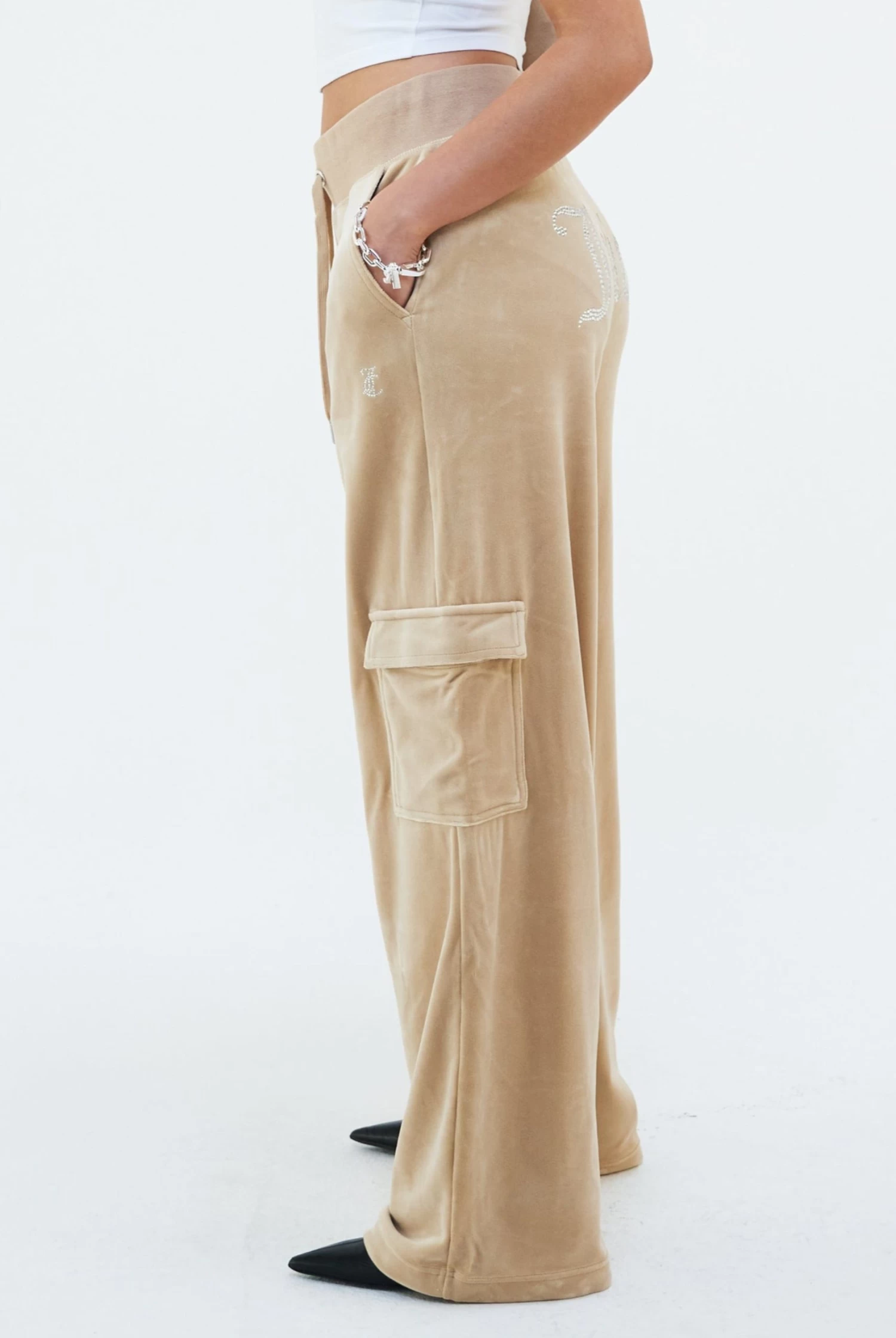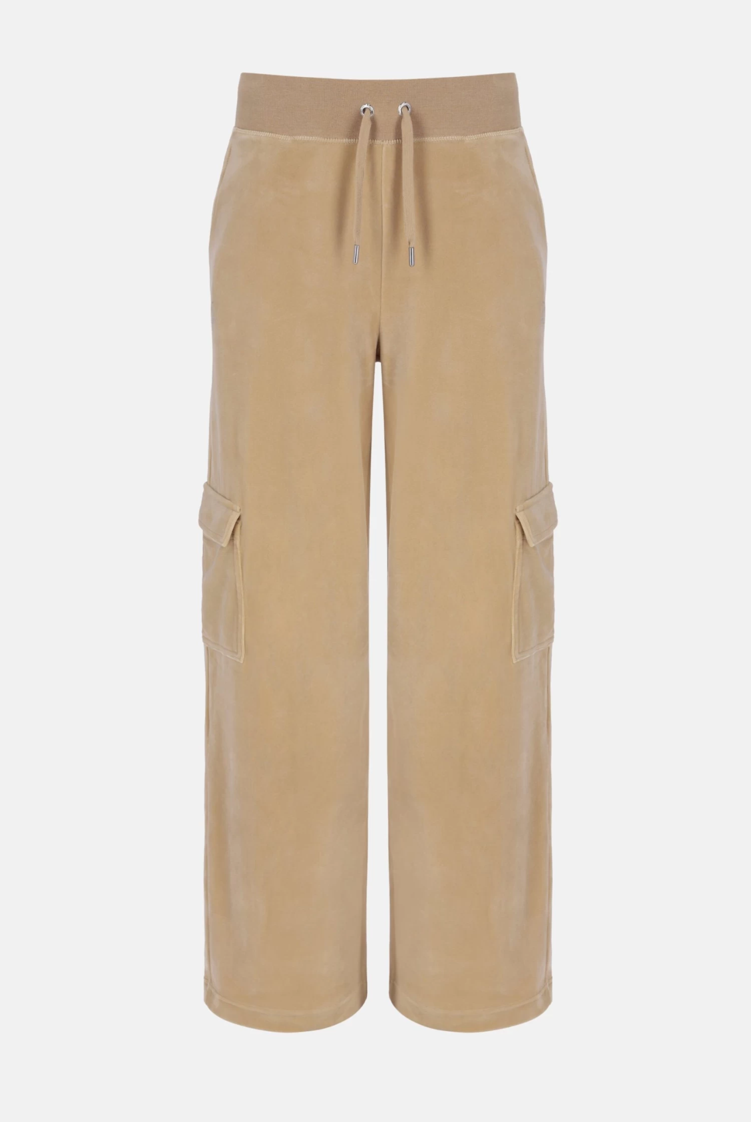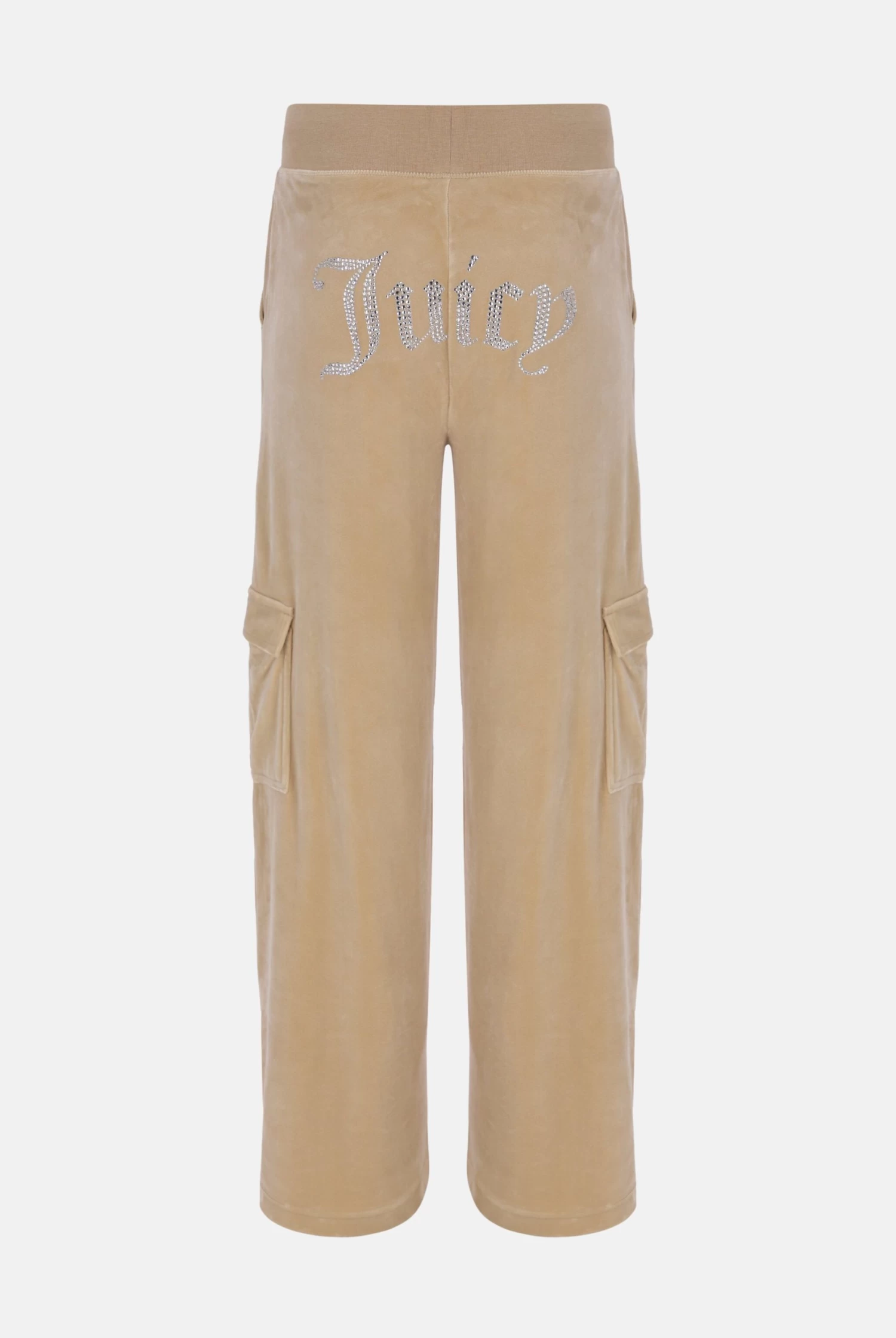 Wide-leg cargo track pant in nomad classic velour. These bottoms feature side hip pockets, cargo pockets down leg and a deep ribbed adjustable waistband with branded silver drawstrings. Branded with the iconic ‘Juicy’ diamante logo on back and diamante ‘JC’ logo at left hip.