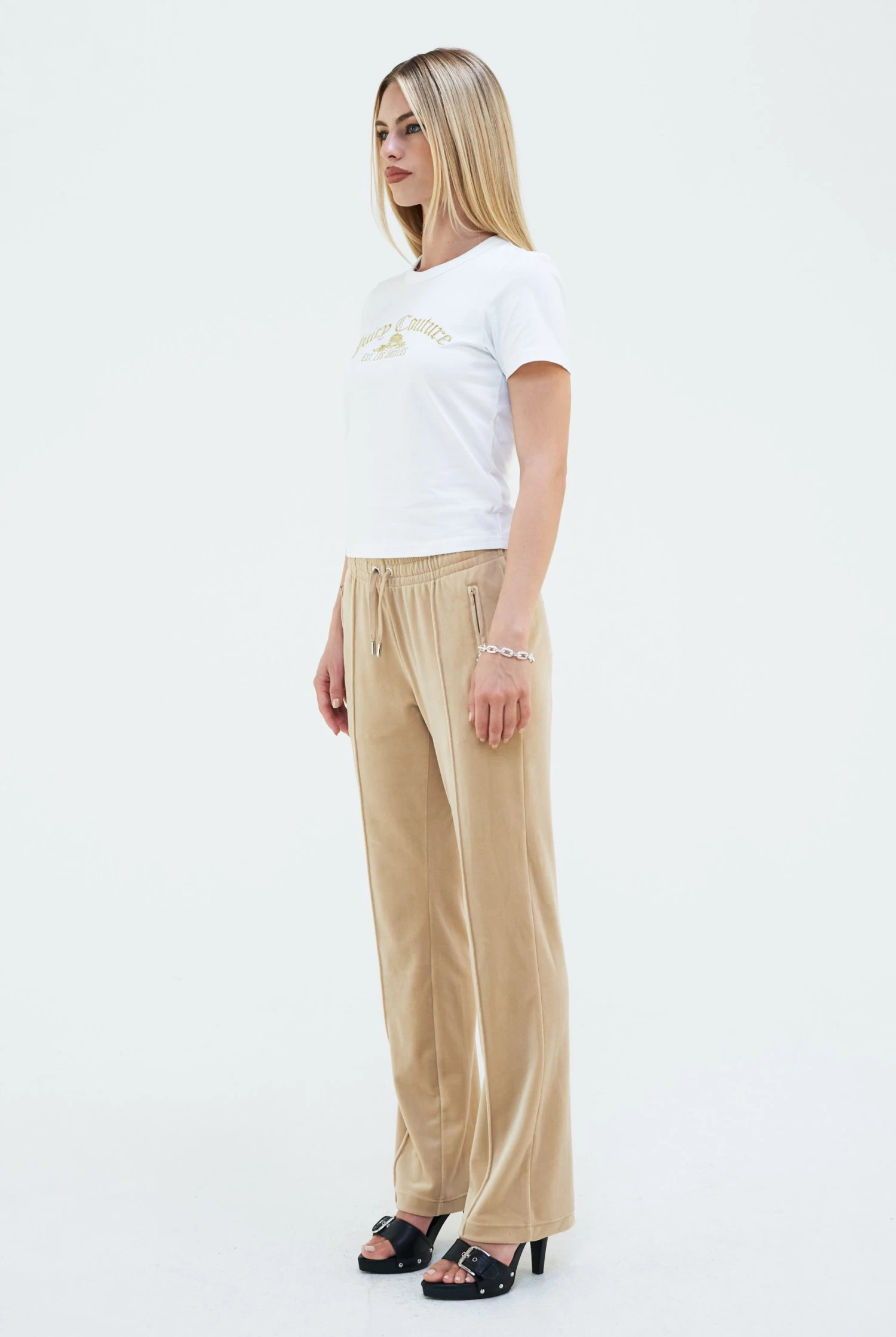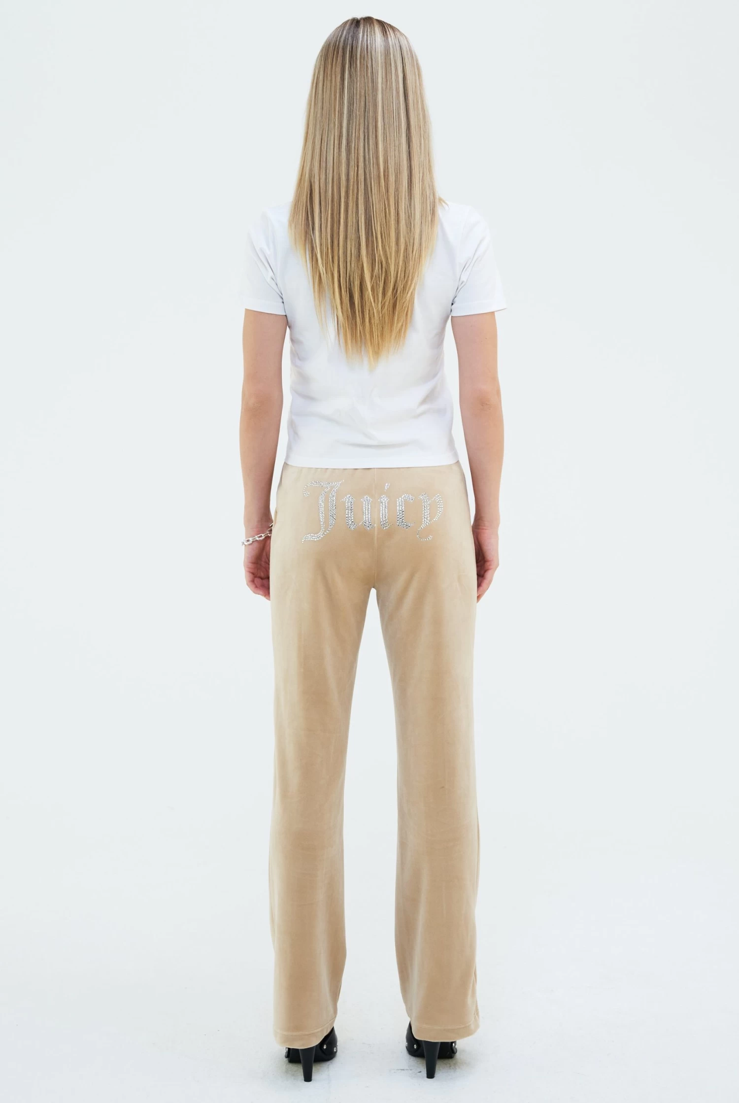 Straight leg diamante embellished tracksuit bottoms in nomad classic velour. Mid-rise fit, with adjustable drawstring waist and pin tucks through front leg. These bottoms feature zip pockets, statement diamante branding on the back and silver branded hardware. Pair with the matching track top for a full iconic Juicy Couture tracksuit.