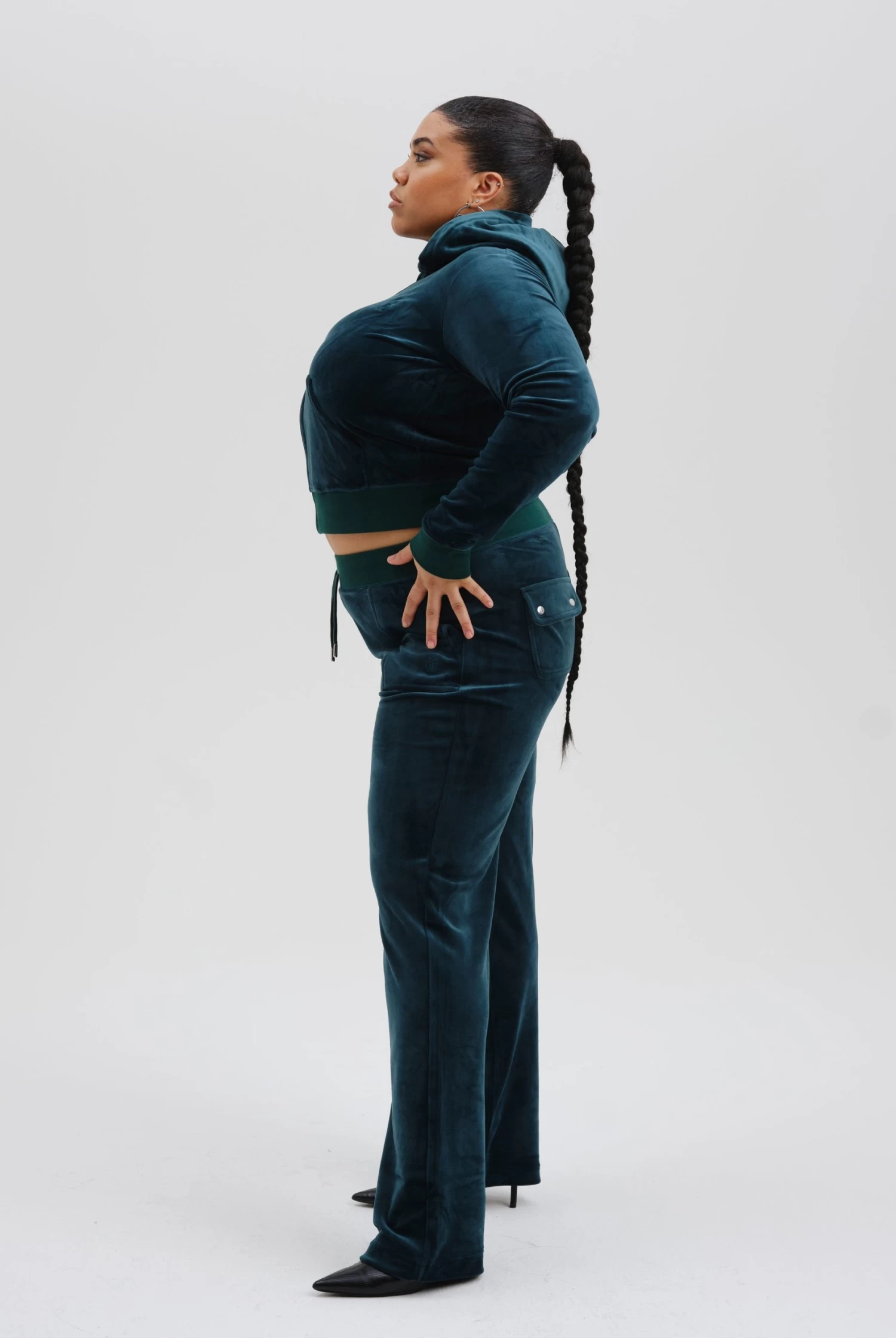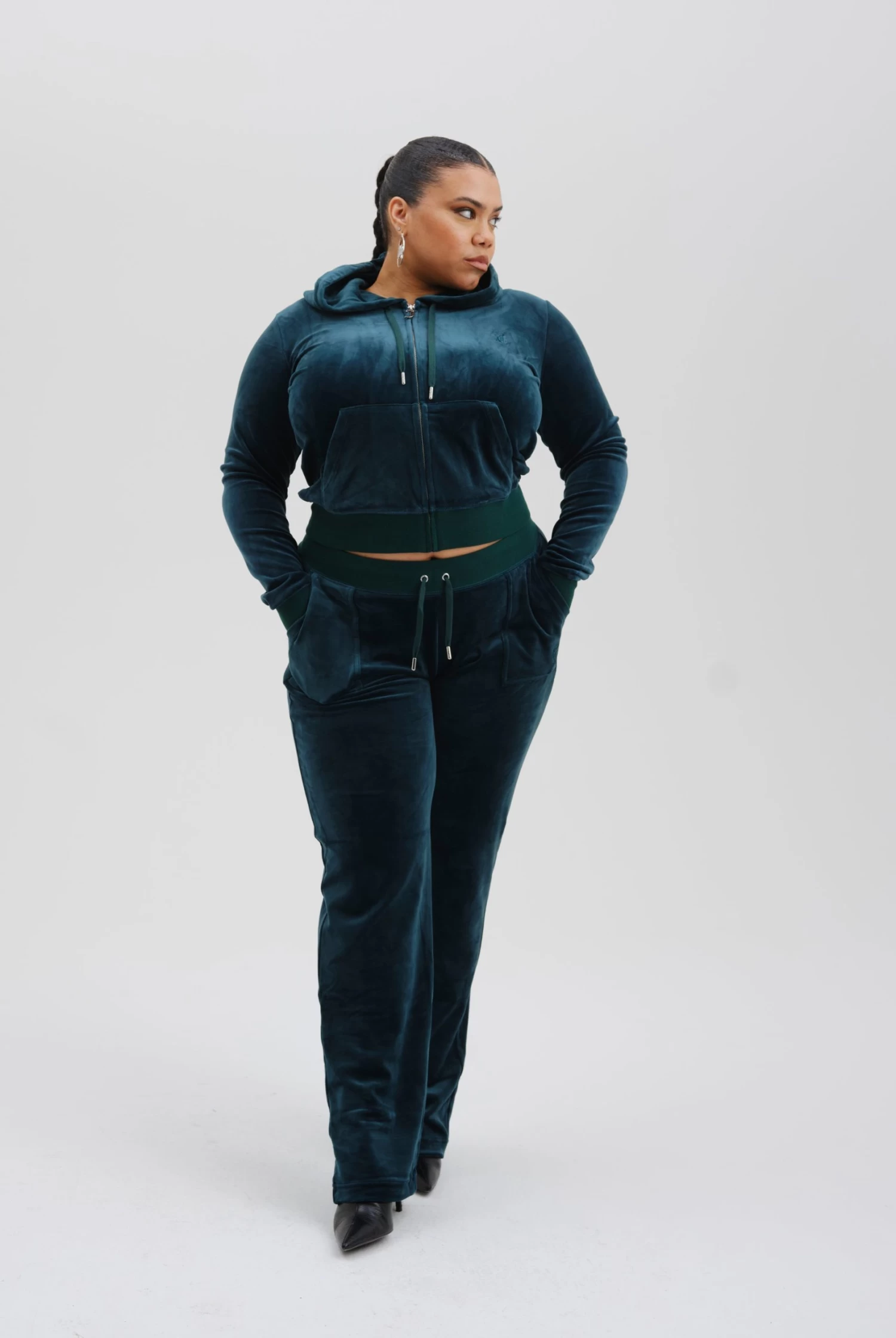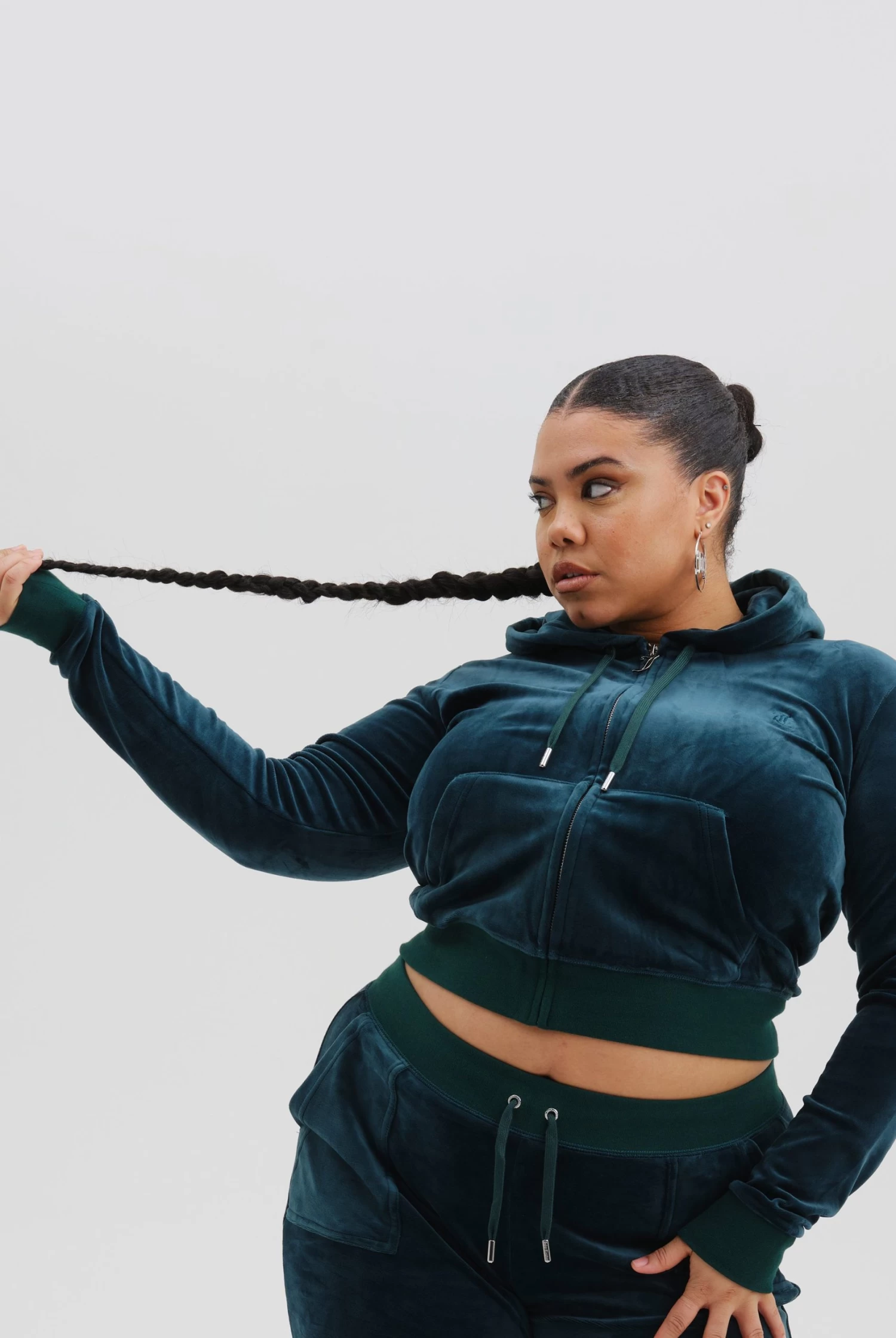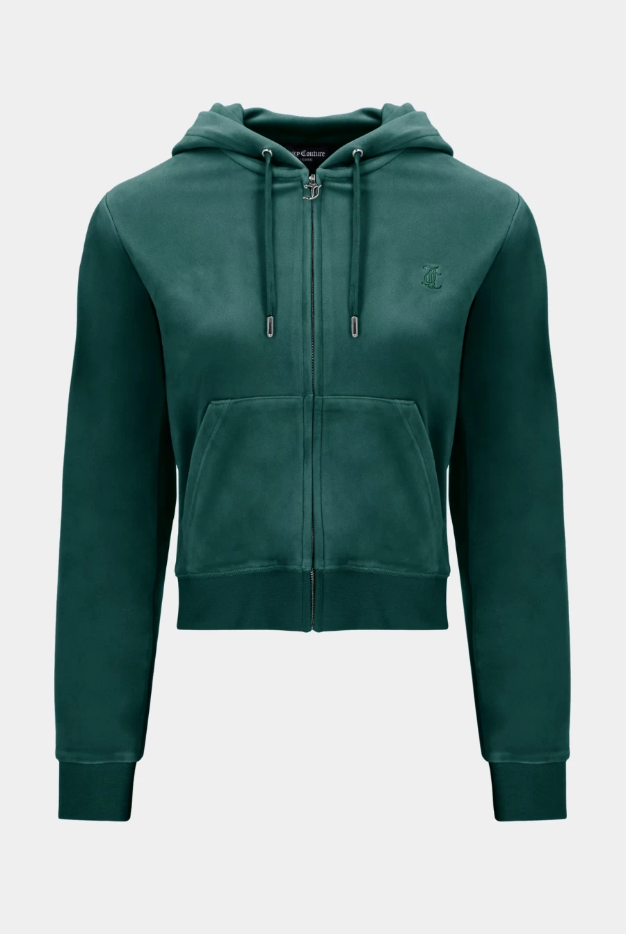 Zip through hoodie in rainforest classic velour. Slim fit, with kangaroo pockets and a self-fabric lined hood, this core hoodie features a statement gothic J zip pull and is branded with a tonal embroidered JC logo at the chest.