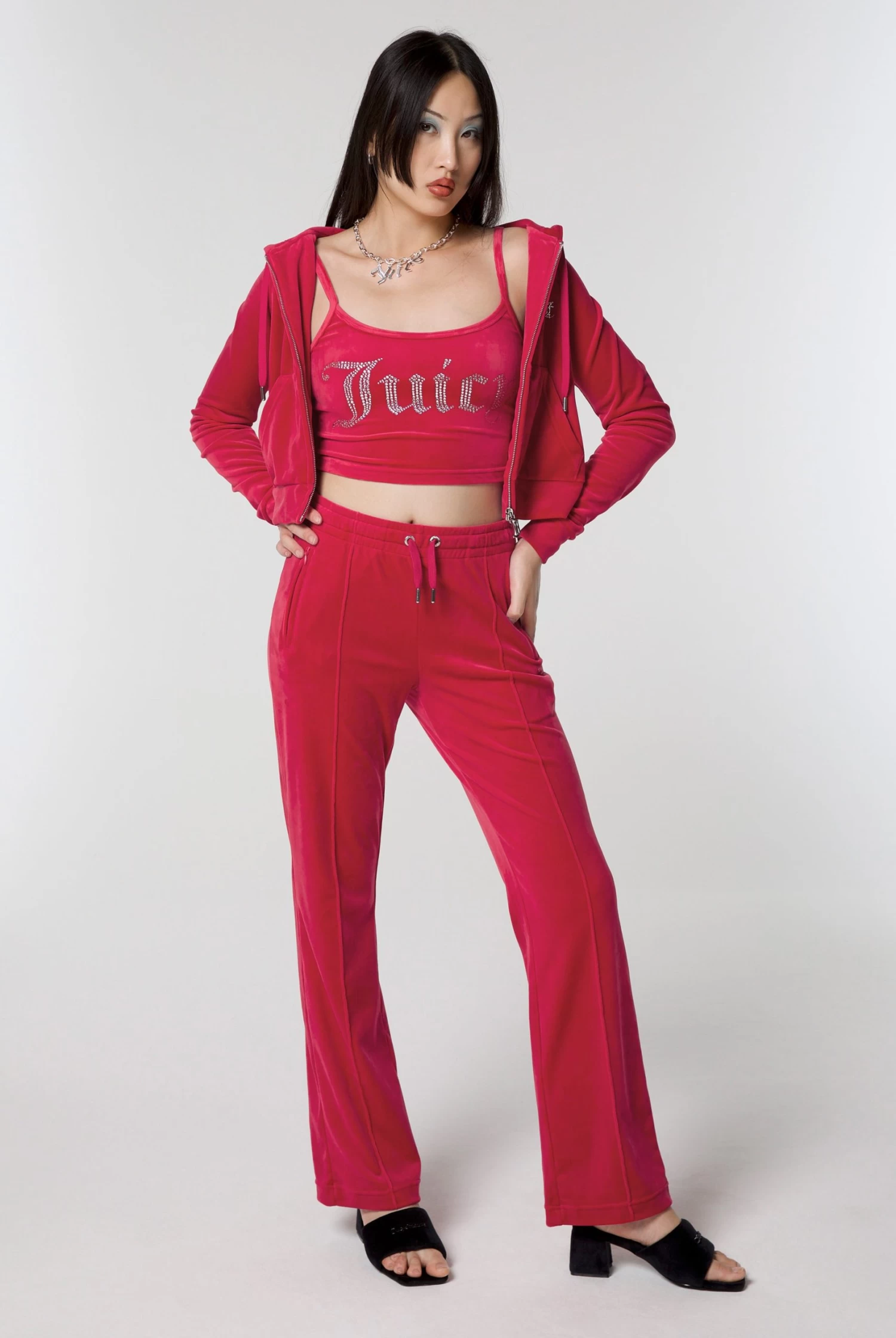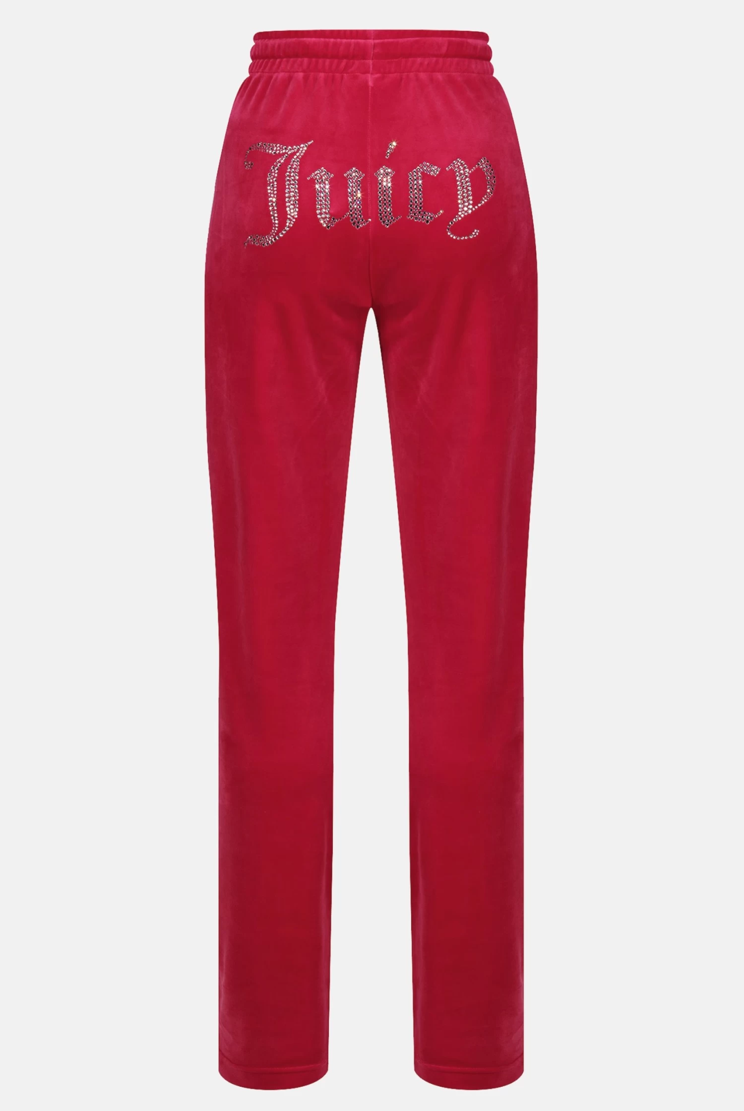 Straight leg diamante embellished tracksuit bottoms in raspberry sorbet classic velour. Mid-rise fit, with adjustable drawstring waist and pin tucks through front leg. These bottoms feature zip pockets, statement diamante branding on the back and silver branded hardware. Pair with the matching track top for a full iconic Juicy Couture tracksuit.