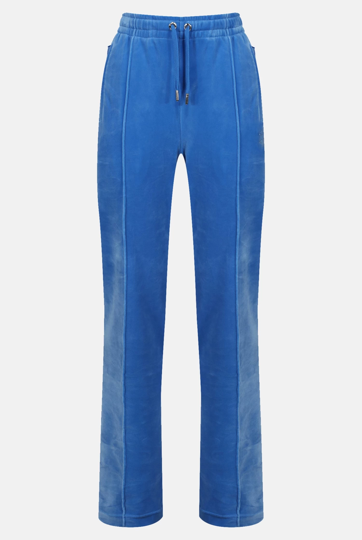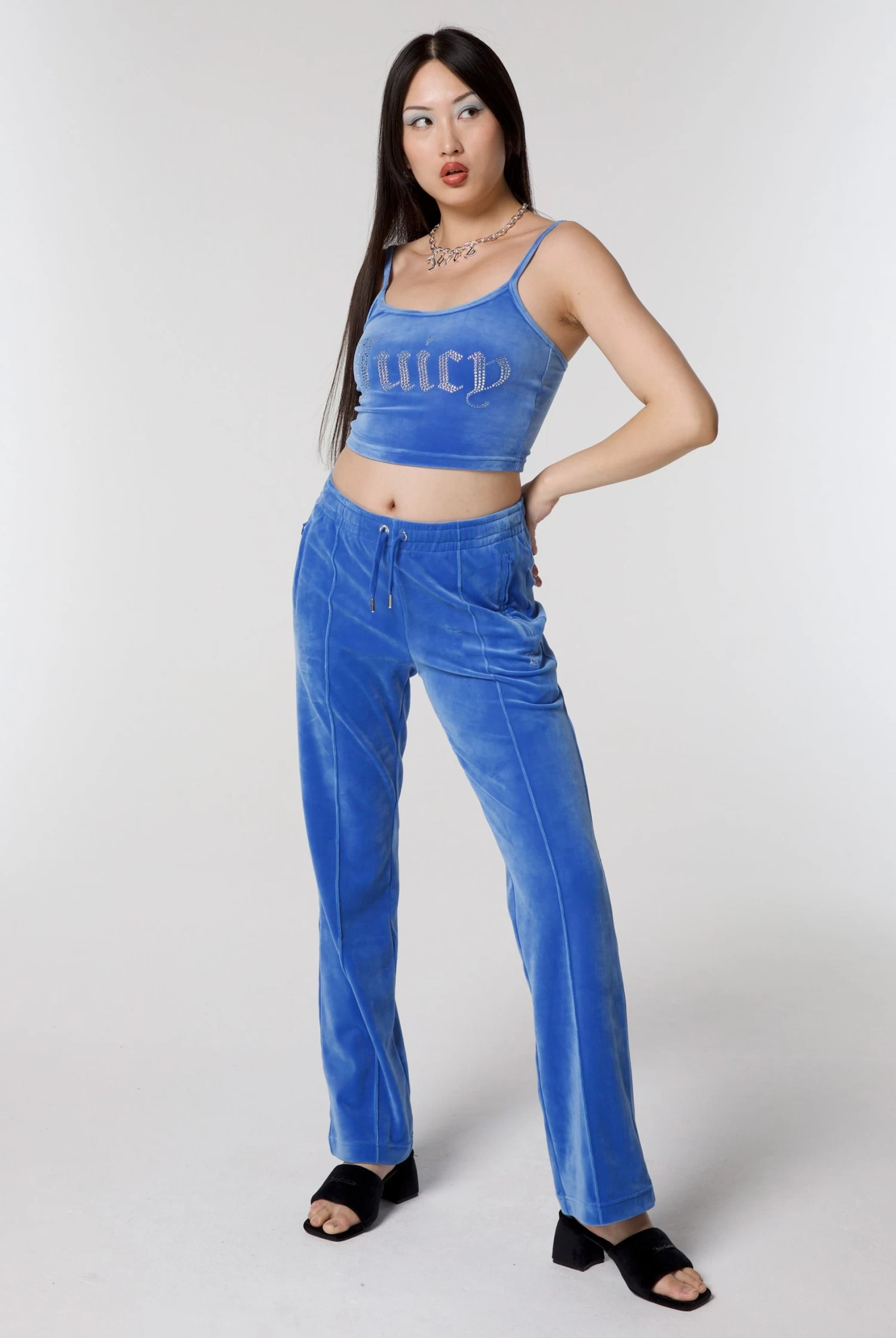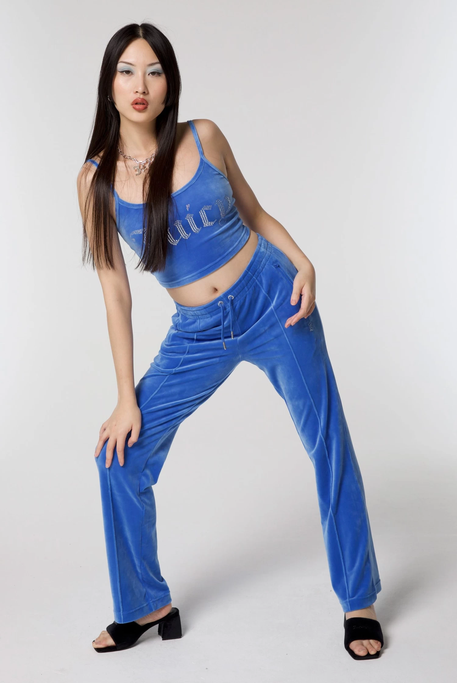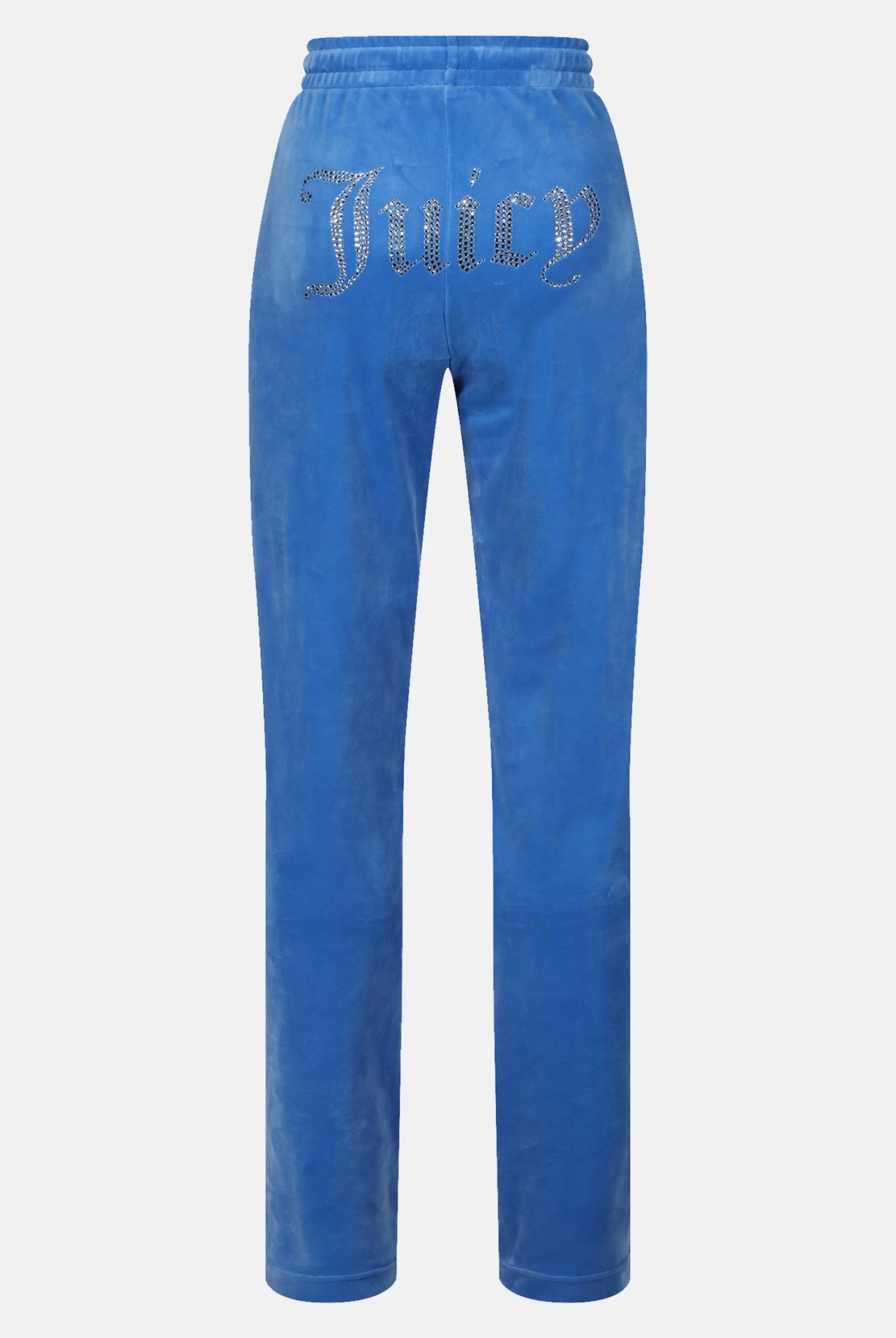 Straight leg diamante embellished tracksuit bottoms in regatta classic velour. Mid-rise fit, with adjustable drawstring waist and pin tucks through front leg. These bottoms feature zip pockets, statement diamante branding on the back and silver branded hardware. Pair with the matching track top for a full iconic Juicy Couture tracksuit.