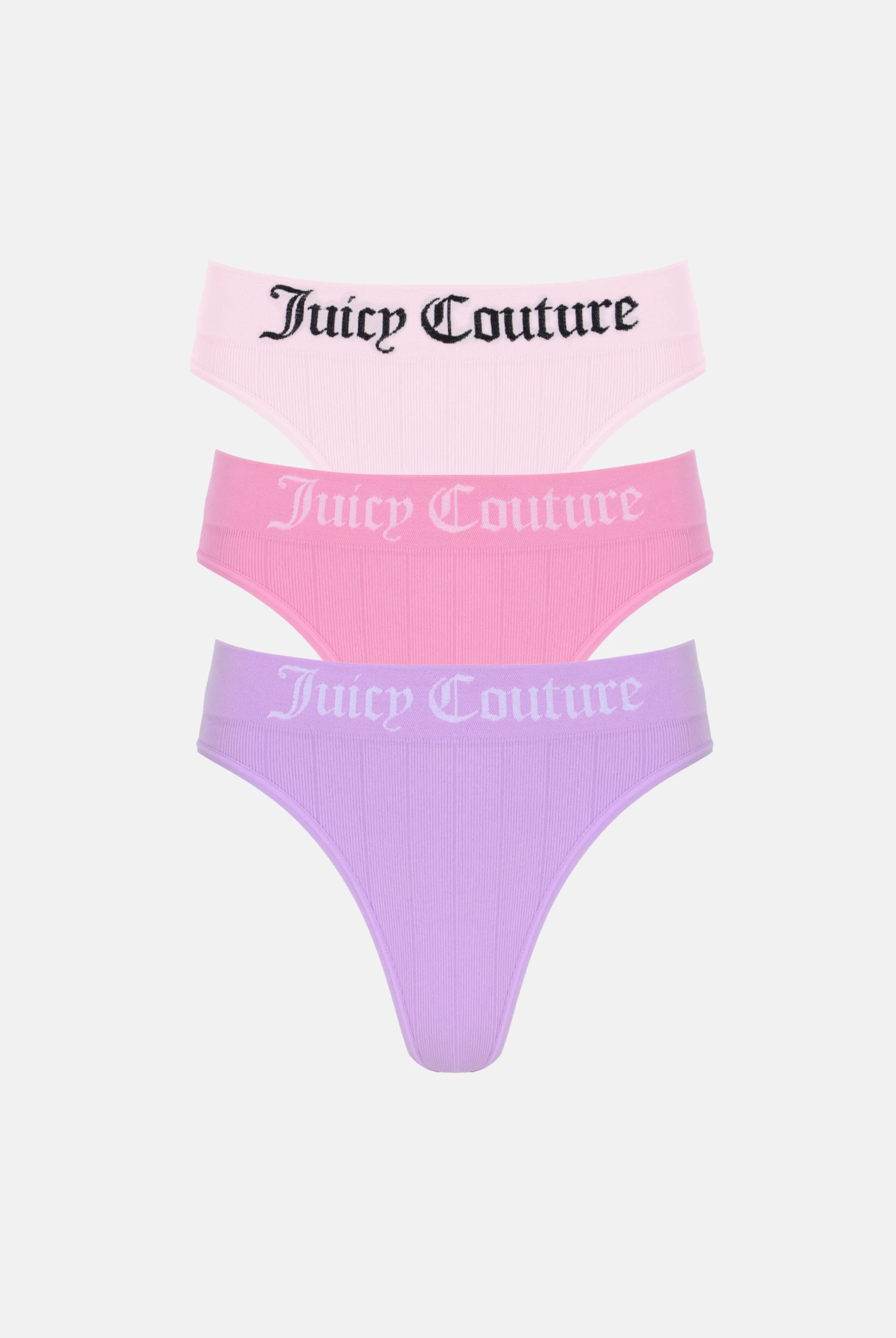 The Juicy Couture Seamless Rib High Leg Brief 3Pk is a set of three high-leg briefs made from a seamless ribbed fabric. They come in a variety of colours and feature the Juicy Couture logo on the waistband. The fabric is made from a blend of nylon and elastane, which provides a comfortable and stretchy fit.