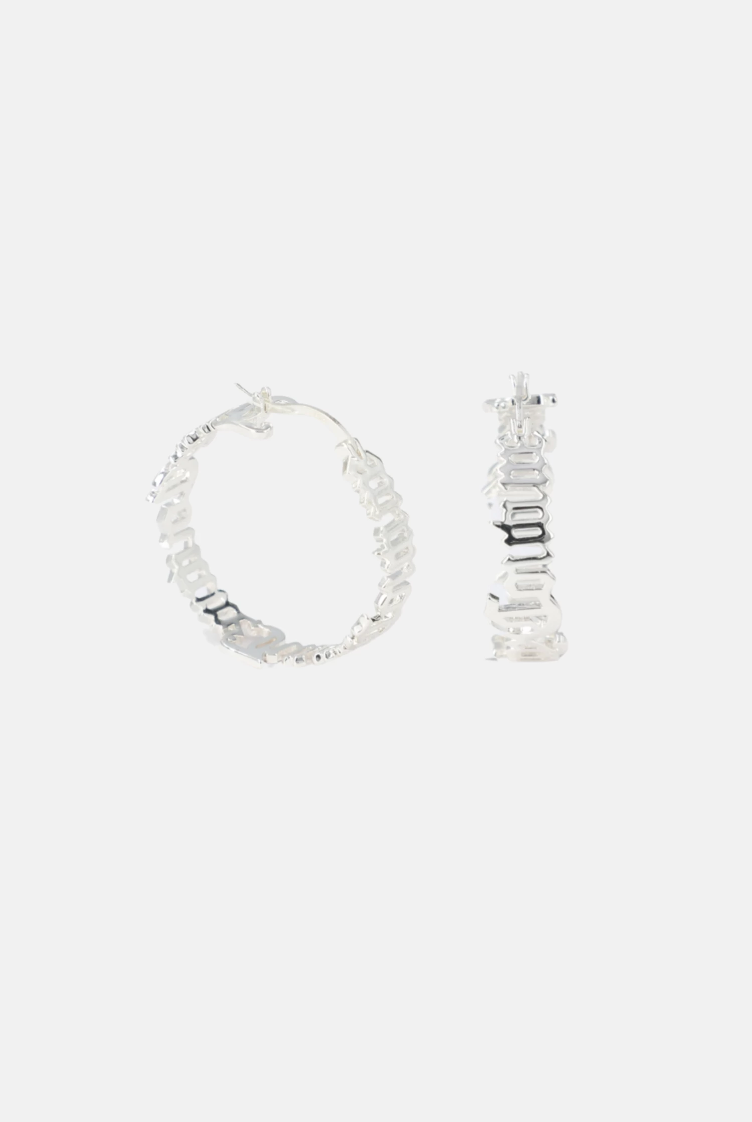 Crafted in silver plate these statement hoop earrings feature the iconic gothic font ‘Juicy Couture’ logo etched around the full circumference of the earring