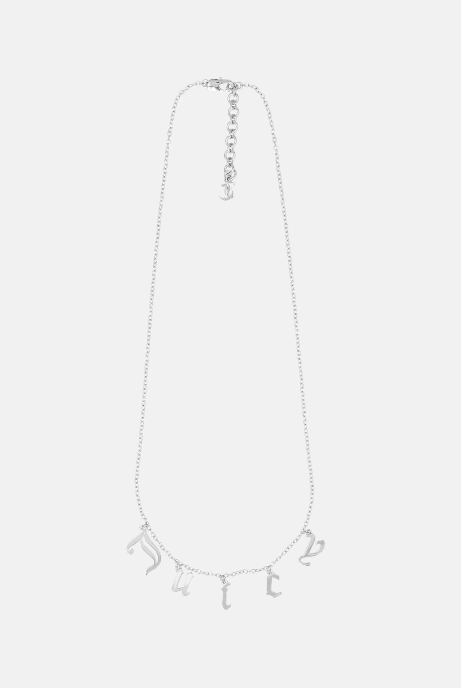 Silver choker necklace set with the iconic gothic font Juicy letters individually set along the silver chain and finished with an adjustable chain and lobster clasp with mini JC charm