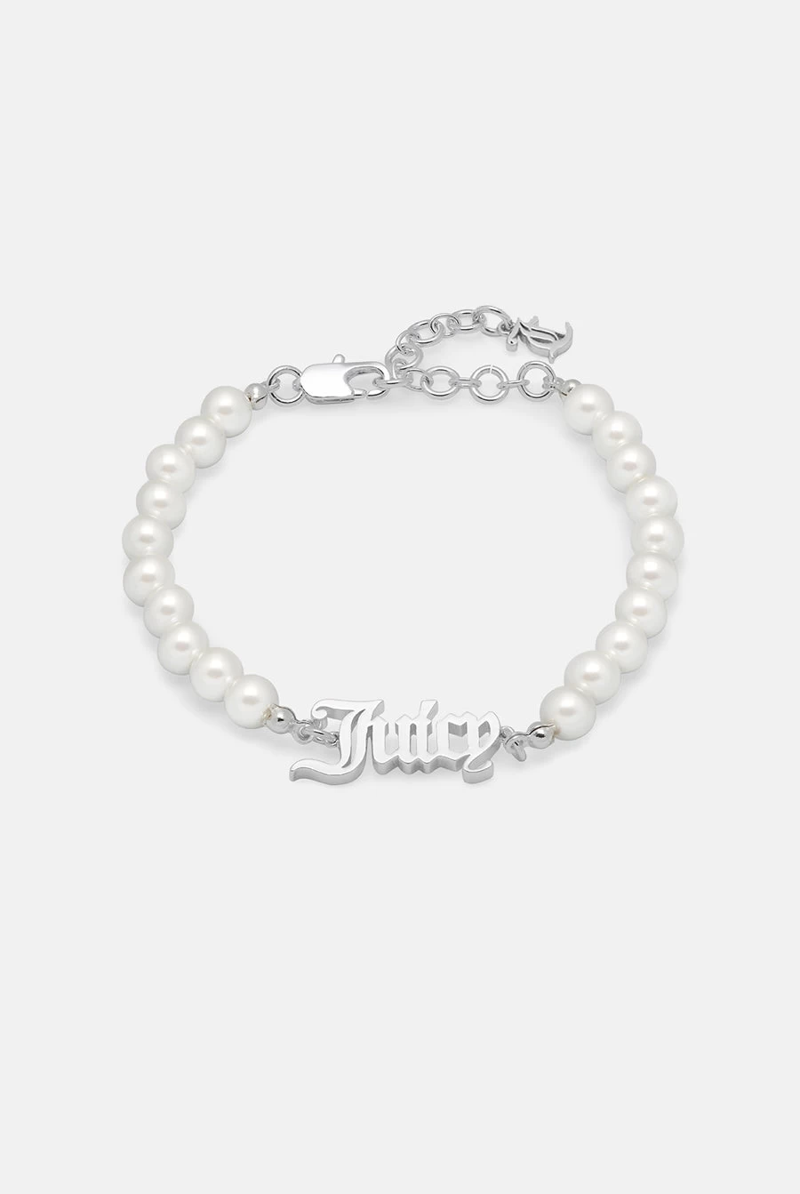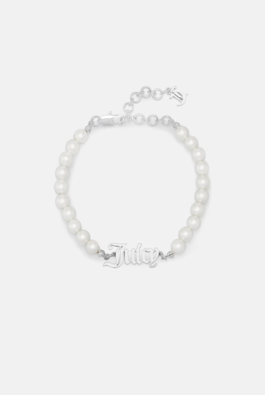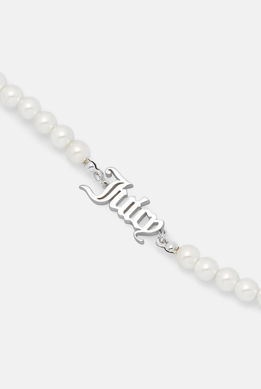 Pearl bracelet, featuring a silver plated iconic gothic font ‘Juicy’ logo. Finished with an adjustable silver plated chain with clasp and mini ‘JC’ charm. Pair with the matching choker to complete the look.