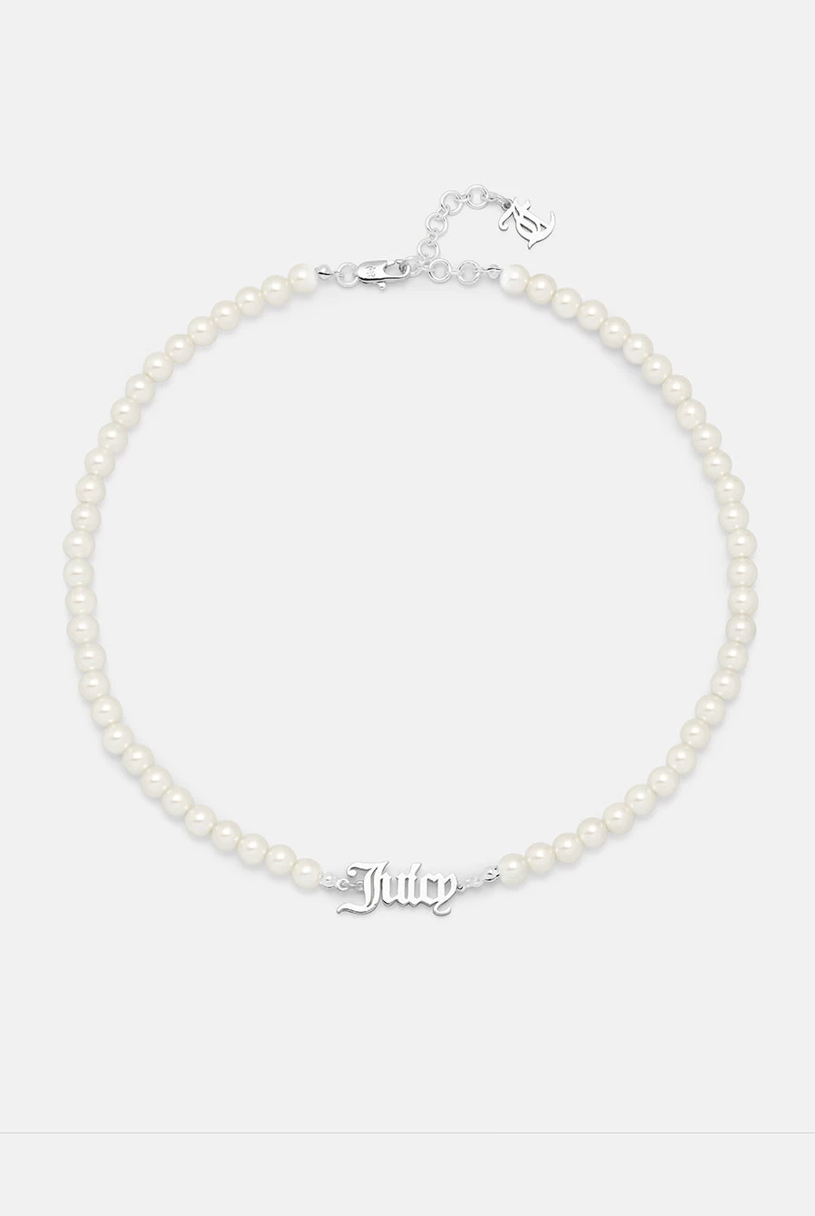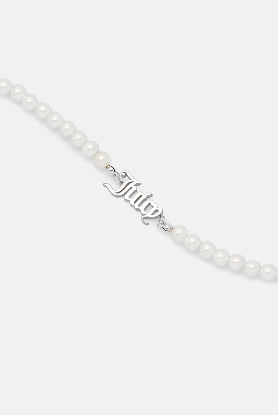 Pearl choker featuring the iconic gothic font ‘Juicy’ logo crafted in silver plate. Finished with a silver plated adjustable chain with clasp and mini ‘JC’ charm. Complete the look with the matching bracelet.