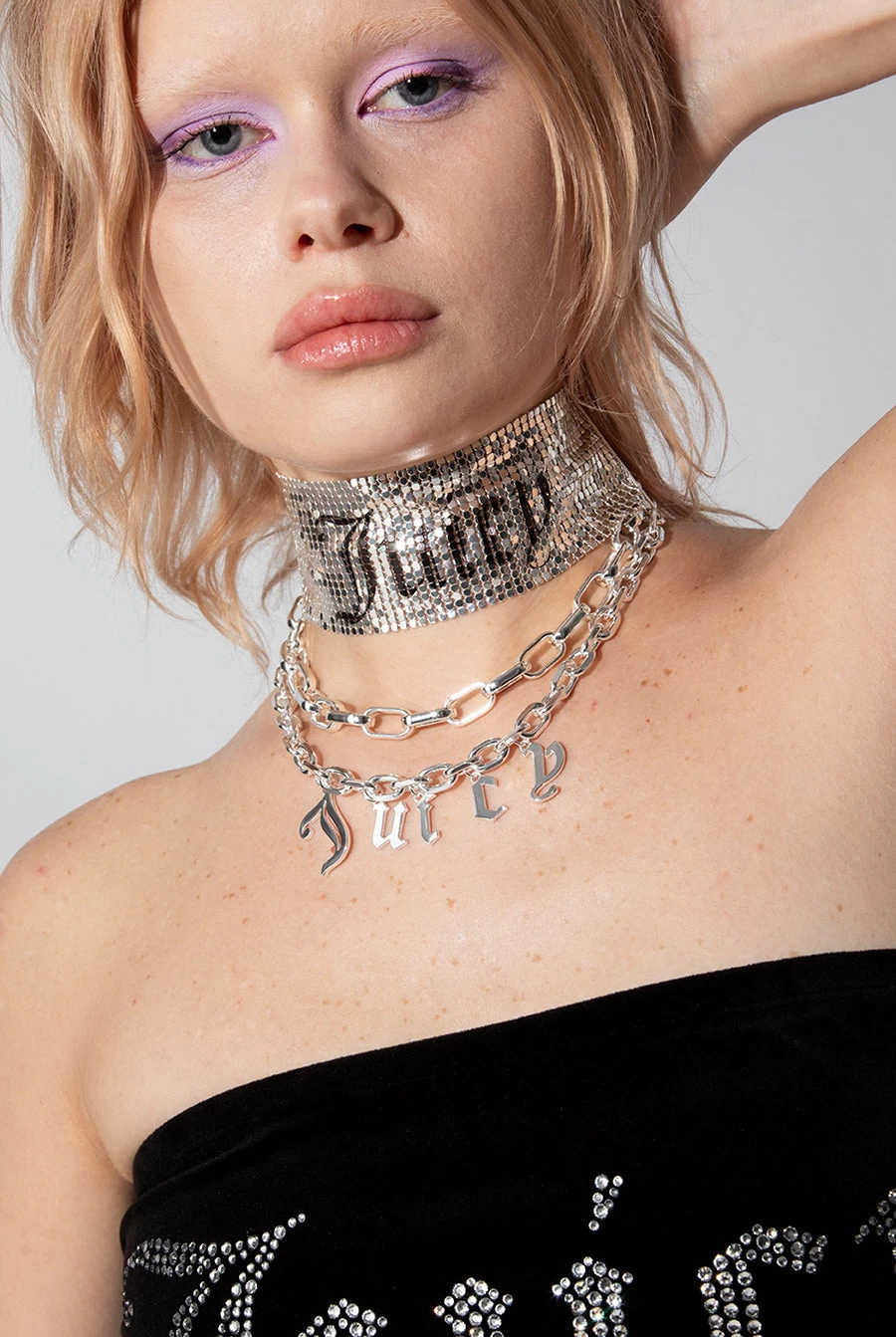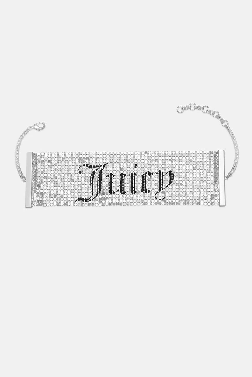 Silver plated mesh style choker with the iconic gothic font ‘Juicy’ logo. Finished with chain extensions for customised comfort and size