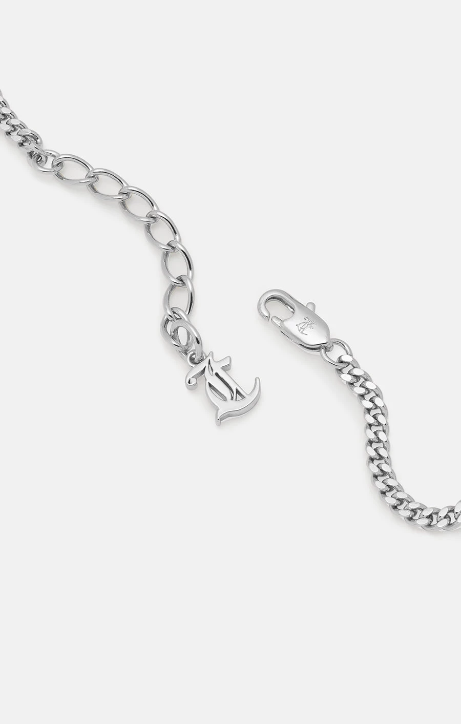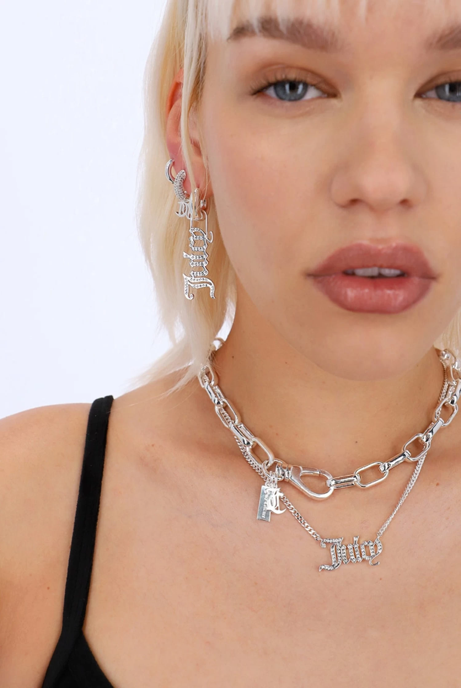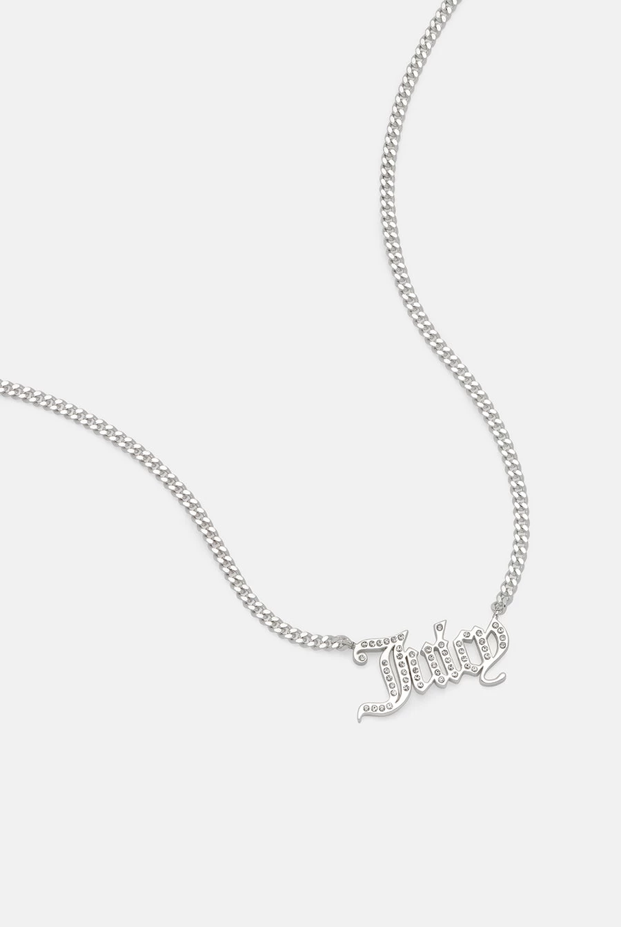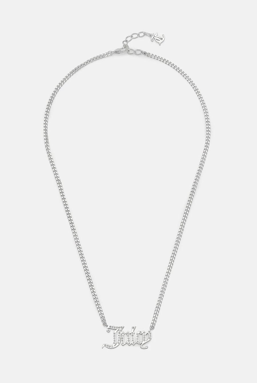 Crafted in silver plate, this pendant necklace features the iconic gothic font ‘Juicy’ logo embellished with pavé crystals. The chain is a medium weight finished with a lobster clasp.