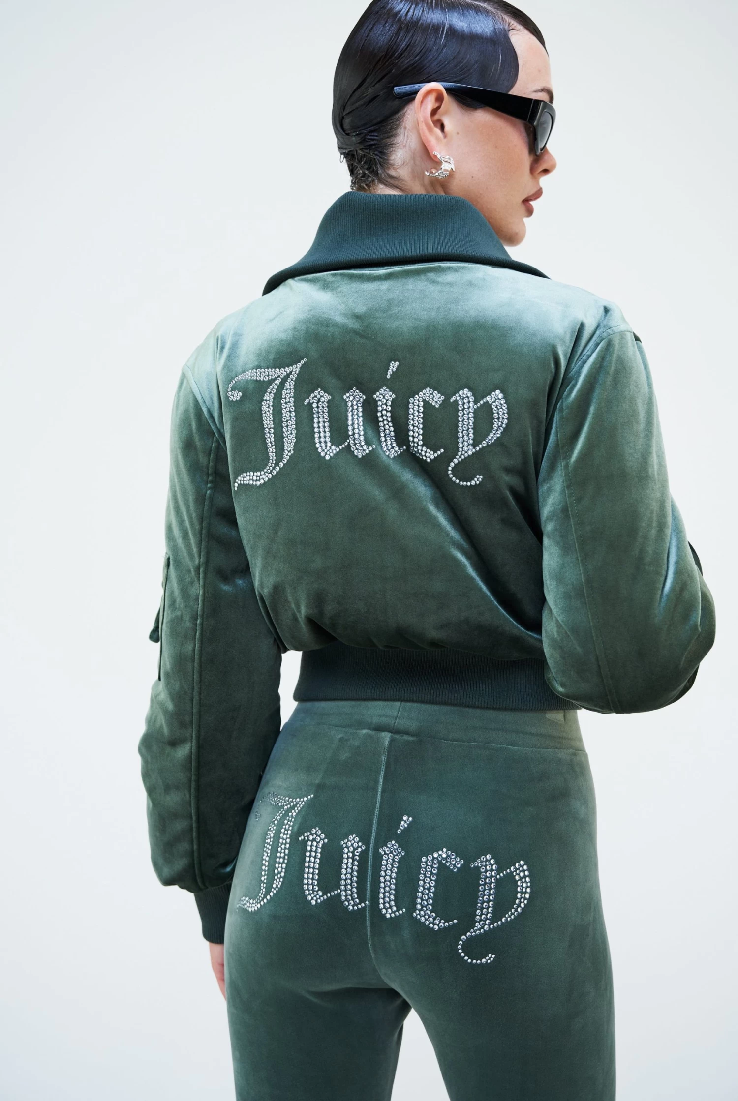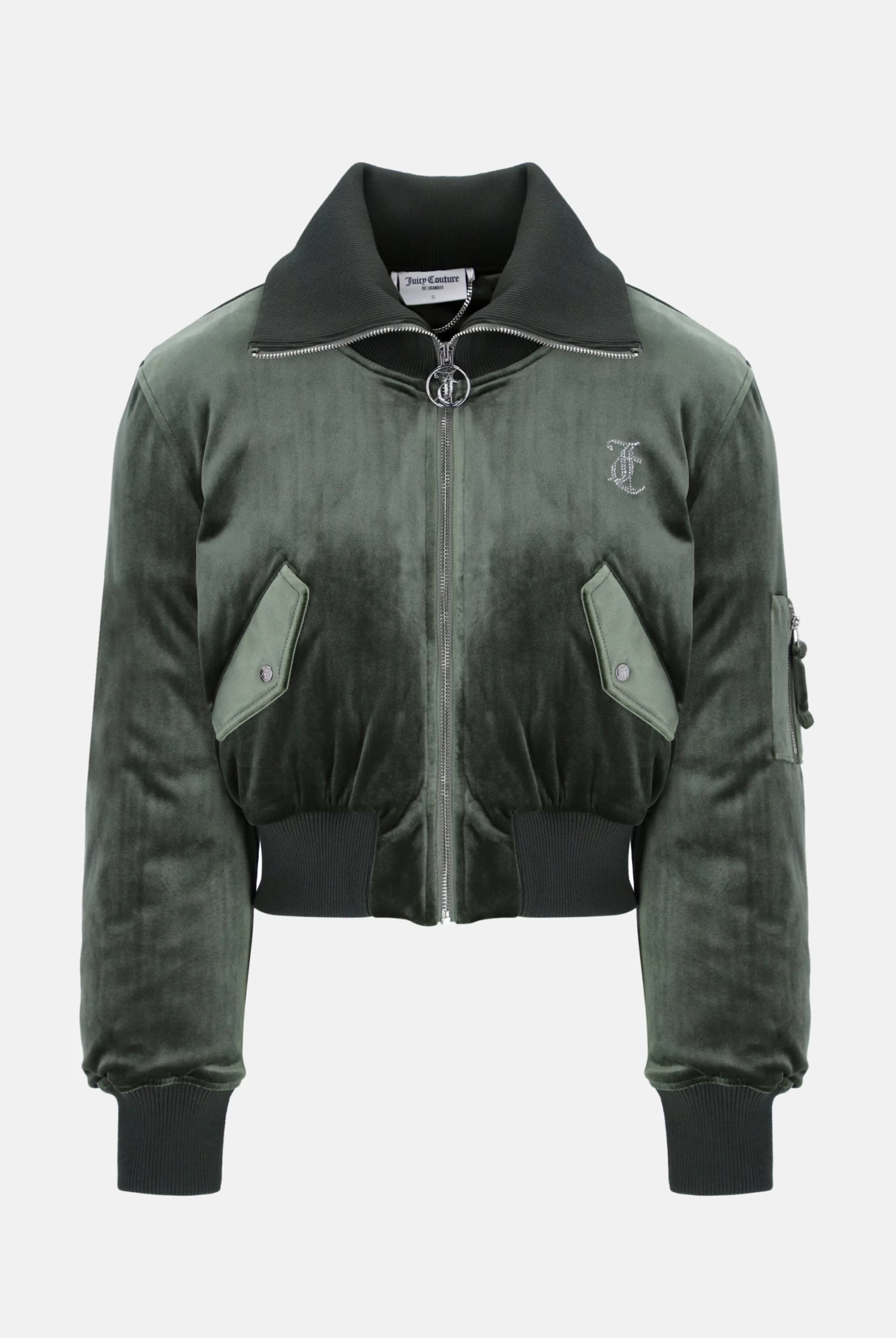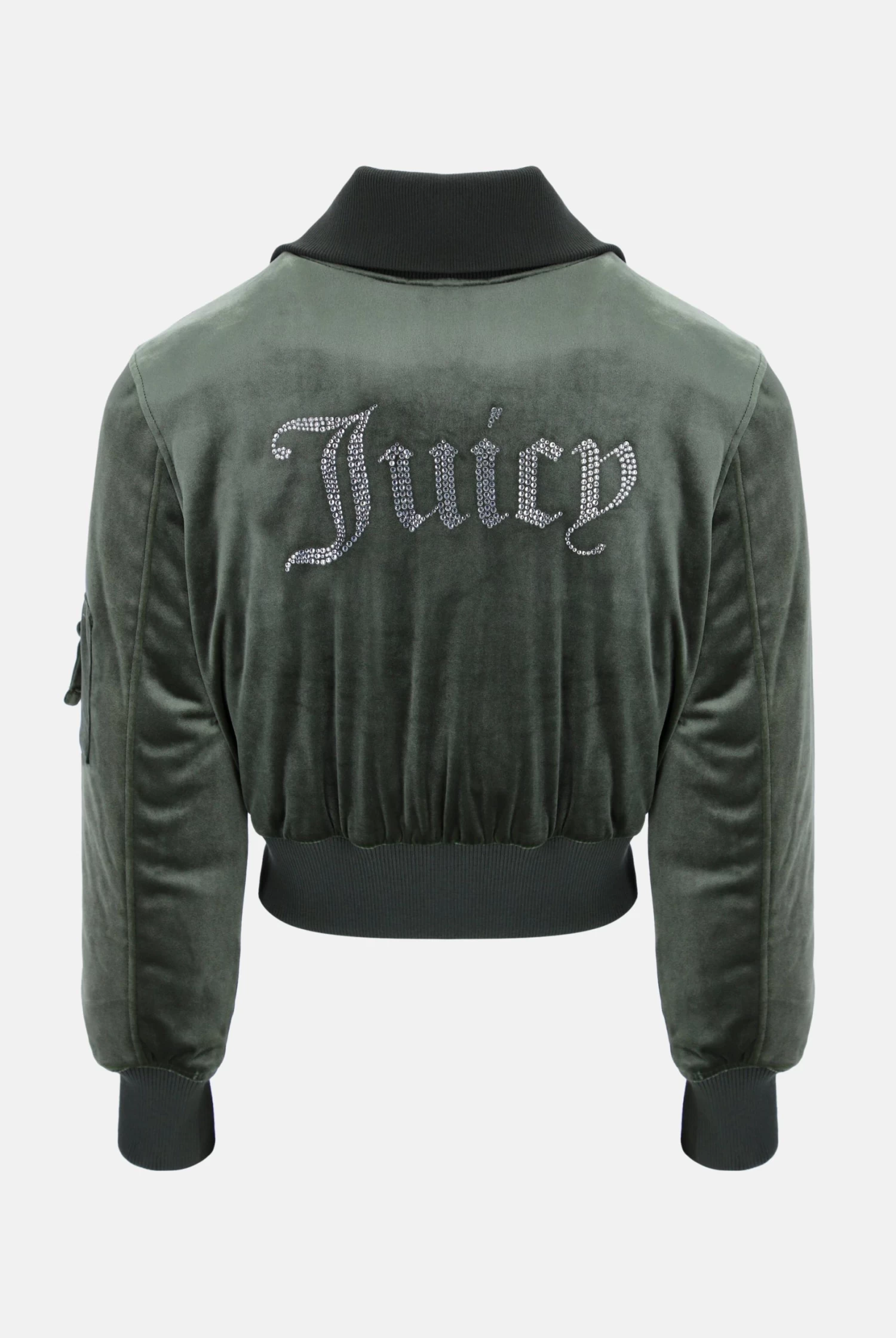 Bomber jacket in thyme classic velour. Featuring a deep rib hem and turned down collar, front side pockets with popper fastening, round ‘JC’ zip pull and a zip pocket on sleeve. This coat is branded with a diamante ‘JC’ crest at left chest and our iconic diamante ‘Juicy’ across back.
