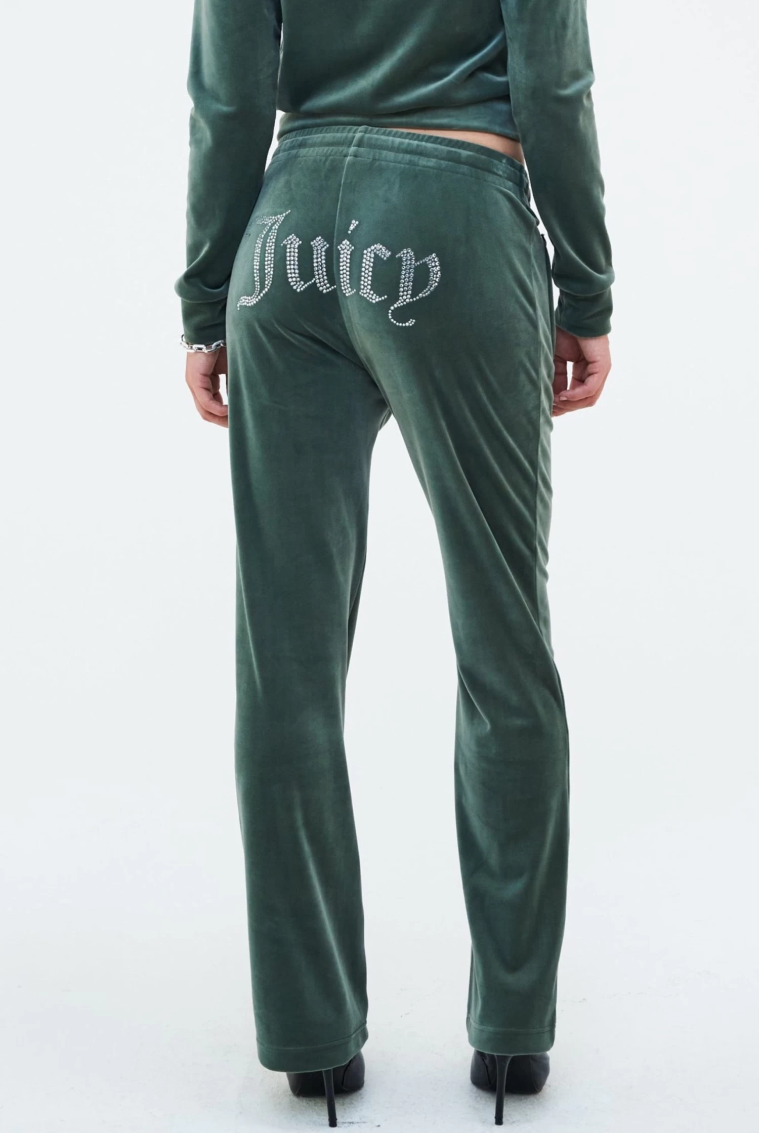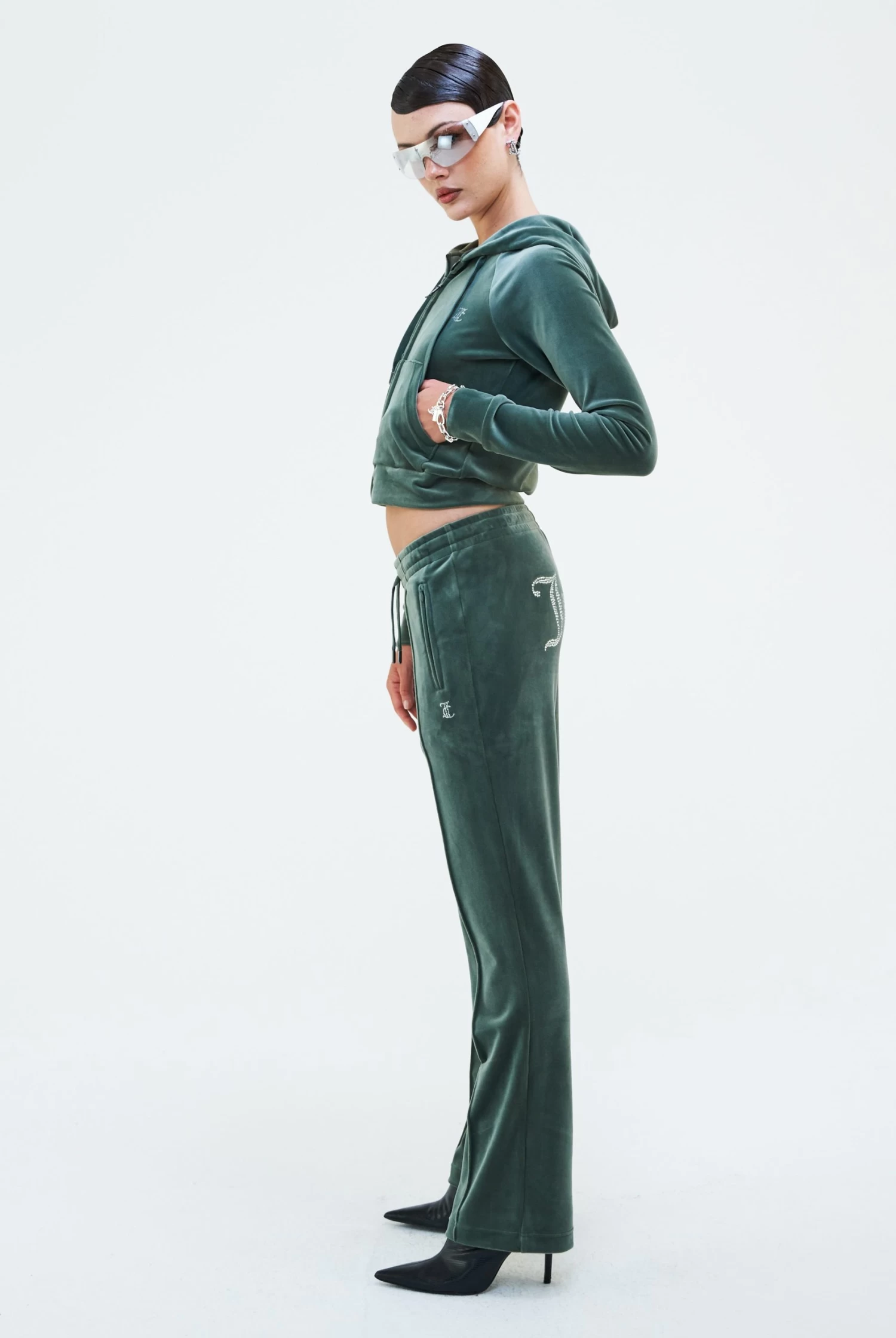 Straight leg diamante embellished tracksuit bottoms in thyme classic velour. Mid-rise fit, with adjustable drawstring waist and pin tucks through front leg. These bottoms feature zip pockets, statement diamante branding on the back and silver branded hardware. Pair with the matching track top for a full iconic Juicy Couture tracksuit.
