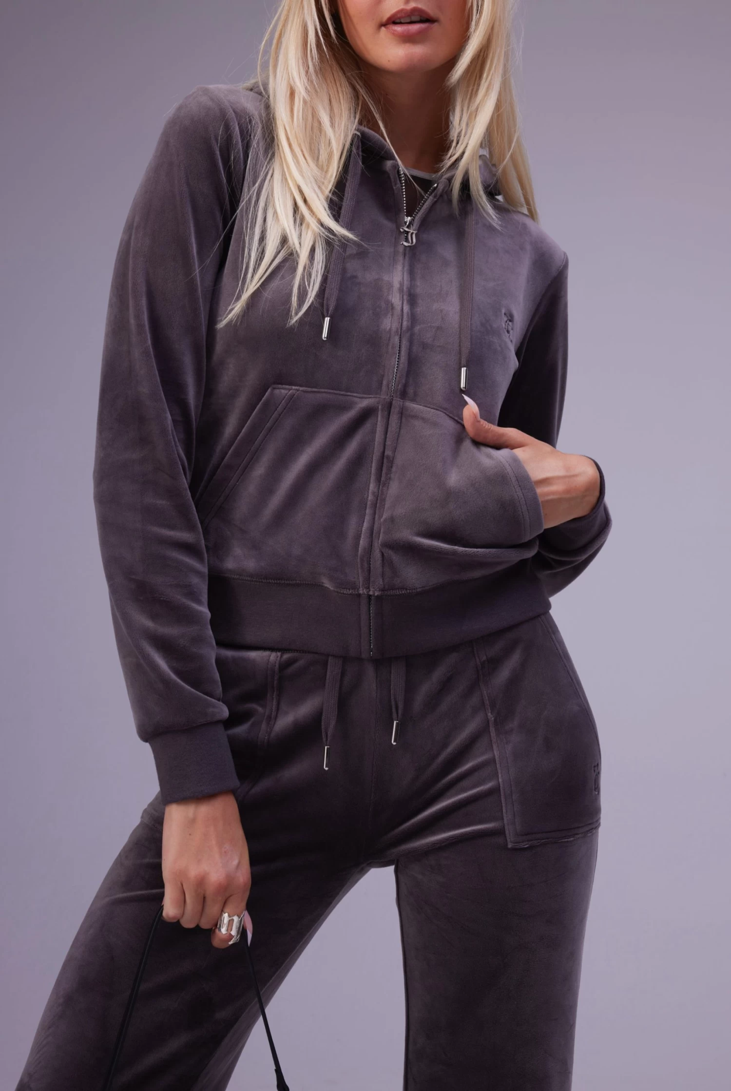 Zip through hoodie in top hat classic velour. Slim fit, with kangaroo pockets and a self-fabric lined hood, this core hoodie features a statement gothic J zip pull and is branded with a tonal embroidered JC logo at the chest.