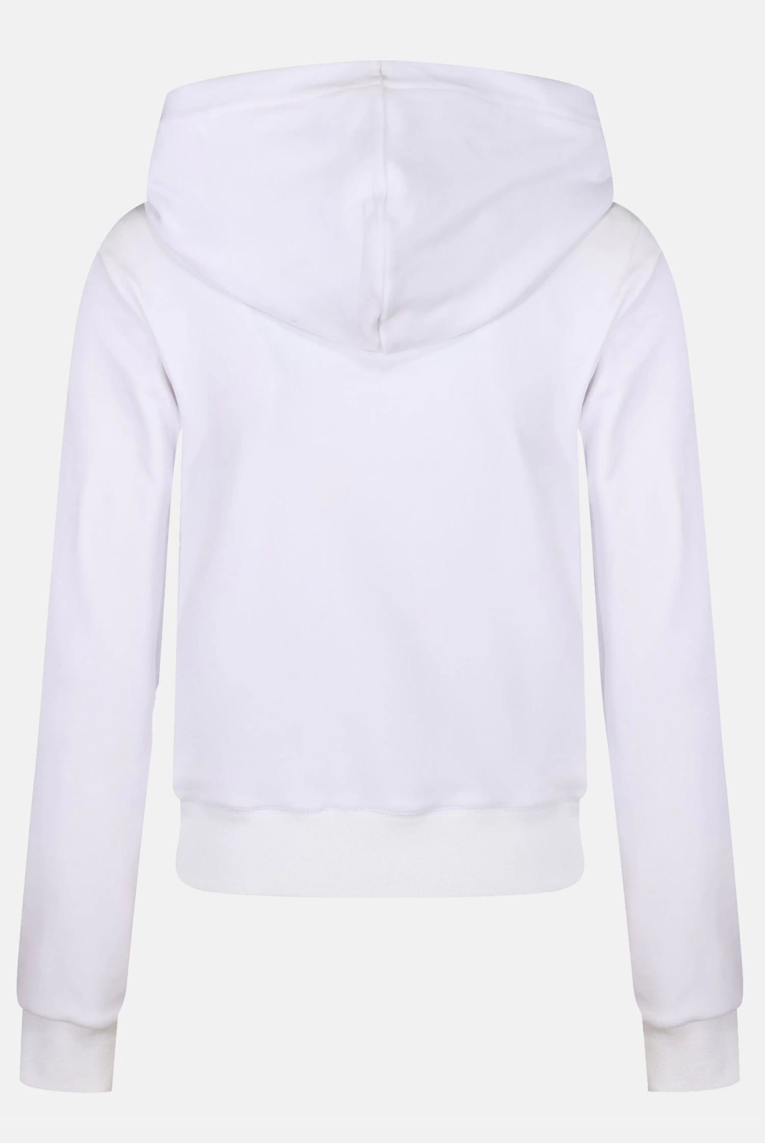 Zip through hoodie in white classic velour. Slim fit, with kangaroo pockets and a self-fabric lined hood, this core hoodie features a statement gothic J zip pull and is branded with a tonal embroidered JC logo at the chest.