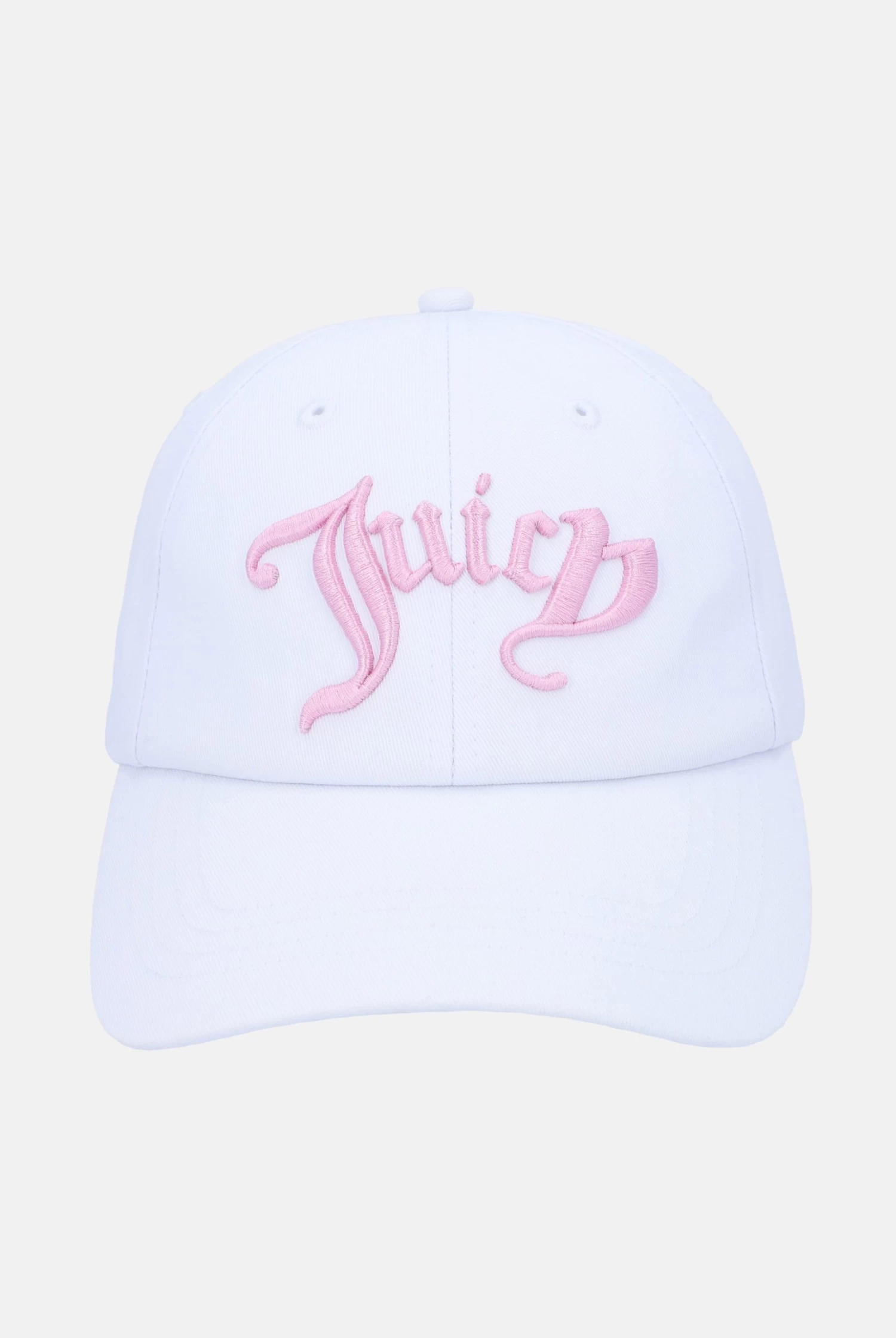 Baseball cap in white cotton canvas. This cap is branded with a contrast embroidered asymmetric ‘Juicy Couture’ logo across front.