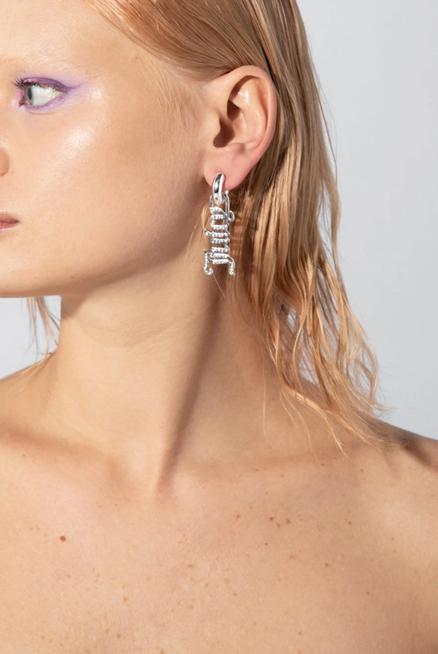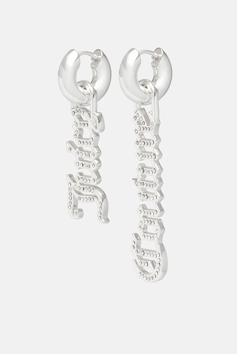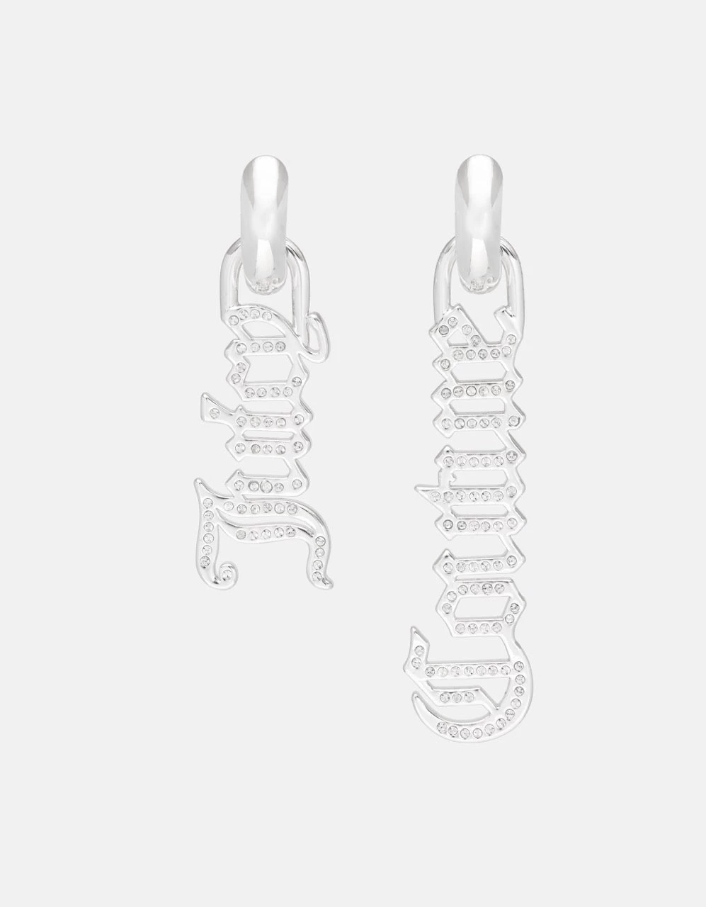 Dangle silver plated earrings featuring the iconic gothic font ‘Juicy Couture’ detachable charms, embellished with pavé crystals.